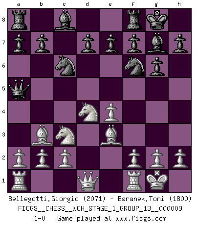 Last move : 1-0 2011 May 18 6:18:30 [Event "FICGS__CHESS__WCH_STAGE_1_GROUP_13__000009"] [Site "FICGS"] [Date "2011.04.01"] [Round "1"] [White "Bellegotti,Giorgio"] [Black "Baranek,Toni"] [Result "1-0"] [WhiteElo "2071"] [BlackElo "1800"] 1.e4 c5 2.Nf3 g6 3.d4 cxd4 4.Nxd4 Nc6 5.Nc3 Bg7 6.Be3 Nf6 7.Bc4 O-O 8.Bb3 Qa5 9.O-O 1-0 This chess game has been lost on time (started : 2011.04.01 10:29:47) Sicilian : Hungarian variation Kingside Castling by player Black (move 7) Kingside Castling by player White (move 9) Player White won this chess game. Follow this game move after move (download)A good sacrifice is one that is not necessarily sound but leaves your opponent dazed and confused. (Rudolph Spielmann) Frage des Reporters: -Worin besteht das Ziel von Gambiteröffnungen? Antwort: -Auf Kosten der Partie einen Ruf als Angriffspieler zu erwerben.- (Siegbert Tarrasch) Cuando tengo las piezas blancas, yo gano porque soy blanco; Cuando tengo las piezas negras, yo gano porque soy Bogolyubov. (Bogolyubov) Pour se monter efficace, un Cavalier a besoin d'avant-postes ! Les Cavaliers font les meilleurs bloqueurs de pions passés. A good player is always lucky. (Capablanca)