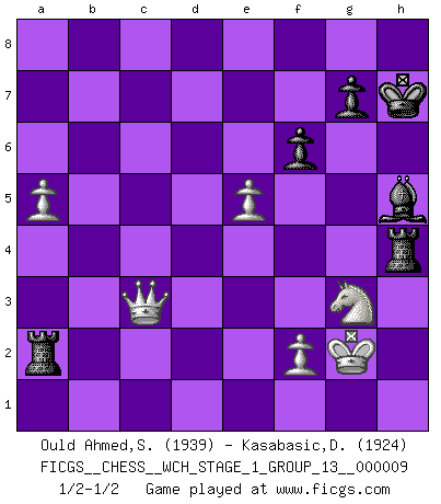 Last move : 1/2-1/2 2011 August 5 0:28:24 [Event "FICGS__CHESS__WCH_STAGE_1_GROUP_13__000009"] [Site "FICGS"] [Date "2011.04.01"] [Round "1"] [White "Ould Ahmed,Samy"] [Black "Kasabasic,Djordje"] [Result "1/2-1/2"] [WhiteElo "1939"] [BlackElo "1924"] 1.d4 d5 2.c4 c6 3.Nf3 Nf6 4.Nc3 dxc4 5.a4 Bf5 6.Ne5 Nbd7 7.Nxc4 Qc7 8.g3 e5 9.dxe5 Nxe5 10.Bf4 Nfd7 11.Bg2 f6 12.O-O Nc5 13.Ne3 Bg6 14.b4 Ne6 15.Qb3 Bf7 16.Qb1 Rd8 17.Rc1 Bg6 18.Qb2 h5 19.a5 a6 20.b5 Bc5 21.bxa6 bxa6 22.Qa2 Bf7 23.Bxe5 Qxe5 24.Bxc6+ Kf8 25.Ne4 Bxe3 26.Qa3+ Kg8 27.Qxe3 Nd4 28.Ba4 h4 29.Rd1 hxg3 30.Nxg3 Qd6 31.Ra3 Qb4 32.Rad3 Qxa4 33.Rxd4 Qxd1+ 34.Rxd1 Rxd1+ 35.Kg2 Rh4 36.Qb6 Kh7 37.Qxa6 Ra4 38.h4 Rxh4 39.e4 Ra1 40.Qc6 Bh5 41.Qc3 Ra2 42.e5 1/2-1/2 QGD Slav : Krause attack Kingside Castling by player White (move 12) This chess game ended in a draw. Follow this game move after move (download)The older I grow, the more I value pawns. (Paul Keres) Ich brauche nur einen Blick auf das Schachbrett zu werfen, und weiß schon, was in der Stellung steckt, was geschehen kann und was geschehen wird. Alle übrigen suchen und prüfen, ich aber weiß es! (José Raúl Capablanca) En manos de Fischer's, una diminuta ventaja teórica es tan buena como tener una Reina de ventaja. (Isaac Kashdan) Même si l'adversaire joue le coup analysé précédemment, recommencez l'analyse en voyant la nouvelle position. Première règle de Blumenfeld Mac users swear by their computers. PC users swear at their computers. (Author unknown)