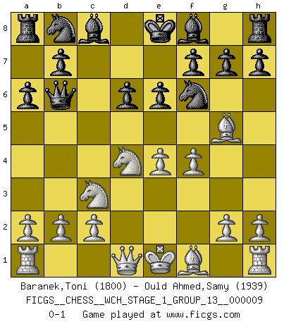Last move : 0-1 2011 May 23 6:44:5 [Event "FICGS__CHESS__WCH_STAGE_1_GROUP_13__000009"] [Site "FICGS"] [Date "2011.04.01"] [Round "1"] [White "Baranek,Toni"] [Black "Ould Ahmed,Samy"] [Result "0-1"] [WhiteElo "1800"] [BlackElo "1939"] 1.e4 c5 2.Nf3 d6 3.d4 cxd4 4.Nxd4 Nf6 5.Nc3 a6 6.Bg5 e6 7.f4 Qb6 0-1 This chess game has been lost on time (started : 2011.04.01 10:29:47) Sicilian : Najdorf, 7...Qb6 Player Black won this chess game. Follow this game move after move (download)Nonsense was the last thing Fischer was interested in, as far as Chess was concerned. (Elie Agur) Schach ist Leben. (Robert James Fischer) La pasion por jugar al Ajedrez es una de las mas inexplicables en el mundo. (H.G. Wells) Vouloir jouer aux échecs contre soi-même est aussi paradoxal que vouloir marcher sur son ombre. (Stefan Zweig) Knowledge will give you power, but character respect. (Bruce Lee)