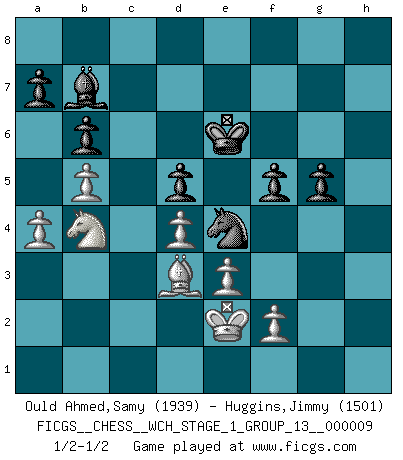 Last move : 1/2-1/2 2011 October 24 11:3:24 [Event "FICGS__CHESS__WCH_STAGE_1_GROUP_13__000009"] [Site "FICGS"] [Date "2011.04.01"] [Round "1"] [White "Ould Ahmed,Samy"] [Black "Huggins,Jimmy"] [Result "1/2-1/2"] [WhiteElo "1939"] [BlackElo "1501"] 1.d4 Nf6 2.c4 e6 3.Nf3 b6 4.g3 Ba6 5.b3 Bb4+ 6.Bd2 Be7 7.Bg2 c6 8.Bc3 d5 9.Ne5 Nfd7 10.Nxd7 Nxd7 11.Nd2 O-O 12.O-O f5 13.a4 Qe8 14.b4 Nf6 15.Qb3 Qh5 16.b5 cxb5 17.cxb5 Bb7 18.Nf3 Ne4 19.Bb4 Bd6 20.Rac1 Qe8 21.Bxd6 Nxd6 22.Ne5 Nf7 23.Nd3 Nd6 24.Ne5 Nf7 25.Nc6 Nd8 26.Nb4 Qd7 27.Rc3 Nf7 28.Rfc1 Rfc8 29.e3 Rxc3 30.Rxc3 Rc8 31.Bf1 Rxc3 32.Qxc3 Nd6 33.Bd3 g6 34.Kf1 Kf7 35.Ke2 Qc8 36.Qxc8 Nxc8 37.Kf3 h6 38.h4 Nd6 39.Kf4 Kf6 40.g4 g5+ 41.hxg5+ hxg5+ 42.Kf3 Ne4 43.gxf5 exf5 44.Ke2 Ke6 1/2-1/2 Queen's Indian : Nimzovich variation (exaggerated Fianchetto) Kingside Castling by player Black (move 11) Kingside Castling by player White (move 12) This chess game ended in a draw. Follow this game move after move (download)Of all my Russian books, the defense contains and diffuses the greatest 'warmth' which may seem odd seeing how supremely abstract Chess is supposed to be. (Vladimir Nabokov) Schach ist Krieg, im Schach geht es um testosterongesteuerte Urschreie. (Garry Kasparov) En el Ajedrez, cuando menos, el valiente hereda la tierra. (Edmar Mednis) Soyez une menace à chaque fois que vous vous asseyez pour jouer. (Ken Smith) Every now and then a man's mind is stretched by a new idea and never shrinks back to its former dimensions. (Oliver Wendell Holmes, Sr.)