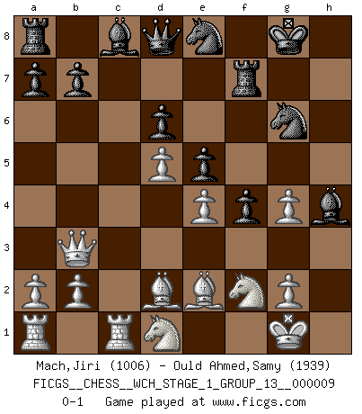 Last move : 0-1 2011 August 3 19:18:11 [Event "FICGS__CHESS__WCH_STAGE_1_GROUP_13__000009"] [Site "FICGS"] [Date "2011.04.01"] [Round "1"] [White "Mach,Jiri"] [Black "Ould Ahmed,Samy"] [Result "0-1"] [WhiteElo "1006"] [BlackElo "1939"] 1.d4 Nf6 2.c4 g6 3.Nc3 Bg7 4.e4 d6 5.Nf3 O-O 6.Be2 e5 7.O-O Nc6 8.d5 Ne7 9.Ne1 Nd7 10.Nd3 f5 11.Bd2 Nf6 12.f3 f4 13.c5 g5 14.cxd6 cxd6 15.Nf2 h5 16.h3 Ng6 17.Qc2 Rf7 18.Rfc1 g4 19.fxg4 hxg4 20.hxg4 Ne8 21.Qb3 Bf6 22.Ncd1 Bh4 0-1 King's Indian : Orthodox, Aronin-Taimanov variation (Yugoslav attack / Mar del Plata variation) Kingside Castling by player Black (move 5) Kingside Castling by player White (move 7) Player Black won this chess game. Follow this game move after move (download)In Chess, as it is played by masters, chance is practically eliminated. (Emanuel Lasker) Ich bin der einzige Schachspieler, der sich während der Vorbereitungen zum Turnier verletzt hat. (Woody Allen) Cuando veas una buena jugada, trata de encontrar otra mejor. (Emanuel Lasker) Comme les marins qui ont mille raisons différentes d'aller en mer, les joueurs d'échecs en ont tout autant avant de s'installer devant une table et jouer... (Vincent Bertignac, philosophe) Art is not a thing, it is a way. (Elbert Hubbard)