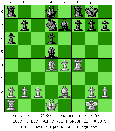 Last move : 0-1 2011 May 28 18:51:33 [Event "FICGS__CHESS__WCH_STAGE_1_GROUP_13__000009"] [Site "FICGS"] [Date "2011.04.01"] [Round "1"] [White "Sautiere,Johan"] [Black "Kasabasic,Djordje"] [Result "0-1"] [WhiteElo "1786"] [BlackElo "1924"] 1.e4 c5 2.Nf3 d6 3.d4 cxd4 4.Nxd4 Nf6 5.Nc3 a6 6.Be2 e5 7.Nb3 Be7 8.O-O O-O 9.Be3 Be6 10.f4 exf4 11.Rxf4 Nc6 12.Nd4 Nxd4 13.Bxd4 Nd7 14.Nd5 Bxd5 0-1 This chess game has been lost on time (started : 2011.04.01 10:29:47) Sicilian : Najdorf, Opovcensky variation Kingside Castling by player White (move 8) Kingside Castling by player Black (move 8) Player Black won this chess game. Follow this game move after move (download)It is peculiar but a fact nevertheless, that gamblers in chess always have enthusiastic followers. (Botvinnik) Ich glaube, ich kenne inzwischen die Gründe für mein Versagen: schachliche Charakterfehler. Ich war nie ein Wunderkind und in meiner gesamten menschlichen Entwicklung immer zu langsam. (Viktor Kortschnoi) Fischer sacrificó virtualmente todo lo que la mayoría de nosotros los 'debiles' (término que él usa) valoramos, respetamos y apreciamos por el amor de un astuto, a menudo hermoso tablero de juego, por el privilegio ambivalente de ser su mas grande maestro. (Paul Kollar) Si je n'étais pas joueur d'échecs, je serais le meilleur dans quelque chose d'autre. (Anatoli Karpov) Real knowledge is to know the extent of one's ignorance. (Confucius)