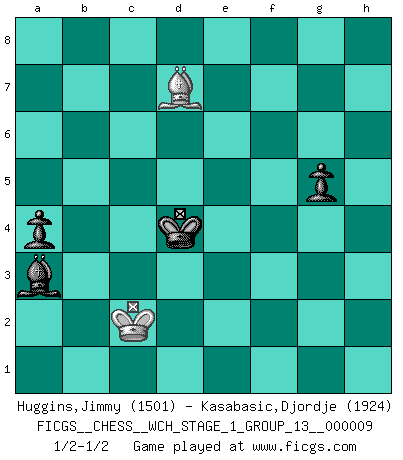 Last move : 1/2-1/2 2011 November 6 20:5:2 [Event "FICGS__CHESS__WCH_STAGE_1_GROUP_13__000009"] [Site "FICGS"] [Date "2011.04.01"] [Round "1"] [White "Huggins,Jimmy"] [Black "Kasabasic,Djordje"] [Result "1/2-1/2"] [WhiteElo "1501"] [BlackElo "1924"] 1.d4 Nf6 2.Nf3 d5 3.c4 e6 4.Nc3 c6 5.e3 Nbd7 6.Qc2 Bd6 7.g4 h6 8.Rg1 e5 9.cxd5 cxd5 10.Nb5 Bb8 11.g5 hxg5 12.Nxg5 e4 13.Bd2 Nb6 14.h3 Bf5 15.Ba5 g6 16.Nc3 Kf8 17.O-O-O Bh2 18.Rh1 Bc7 19.Nb5 Ne8 20.h4 Qd7 21.f3 exf3 22.Bd3 Qxb5 23.Bxb5 Bxc2 24.Kxc2 Nd6 25.Bb4 Kg7 26.Bxd6 Bxd6 27.Nxf3 Rac8+ 28.Kb1 a6 29.Bd3 Rce8 30.Rde1 Nd7 31.h5 Bb4 32.Reg1 Rxe3 33.Bf5 Rxf3 34.Bxd7 Rd3 35.hxg6 Rxh1 36.Rxh1 fxg6 37.Bc8 b6 38.a3 Be7 39.Re1 Kf7 40.Be6+ Ke8 41.Bxd5 Rxd4 42.Bb7 a5 43.Re6 Rd6 44.Rxd6 Bxd6 45.Kc2 Kd7 46.Kd3 g5 47.Bf3 b5 48.Ke4 Kc7 49.Bg4 Kb6 50.Kd3 a4 51.Bd7 Ka5 52.Ke4 Bc5 53.Be6 Kb6 54.Kd3 Bf8 55.Bg4 Bg7 56.Kc2 Kc6 57.Bf3+ Kc5 58.b3 Kb6 59.bxa4 bxa4 60.Kb1 Kc5 61.Kc2 Bf8 62.Bg4 Kd4 63.Bd7 Bxa3 1/2-1/2 Queen's pawn game Queenside Castling by player White (move 17) 10 pieces endgame at move 44 : White KRBPP , Black KBPPP WHITE : King + 1 Rook 1 Bishop 2 Pawns BLACK : King + 1 Bishop 3 Pawns 9 pieces endgame at move 44 : White KBPP , Black KBPPP WHITE : King + 1 Bishop 2 Pawns BLACK : King + 1 Bishop 3 Pawns 8 pieces endgame at move 59 : White KBPP , Black KBPP WHITE : King + 1 Bishop 2 Pawns BLACK : King + 1 Bishop 2 Pawns 7 pieces endgame at move 59 : White KBP , Black KBPP WHITE : King + 1 Bishop 1 Pawn BLACK : King + 1 Bishop 2 Pawns 6 pieces endgame at move 63 : White KB , Black KBPP WHITE : King + 1 Bishop BLACK : King + 1 Bishop 2 Pawns This chess game ended in a draw. Follow this game move after move (download)Those who say they understand Chess, understand nothing. (Robert Hubner) Dass jemand wie Surab Asmaiparaschwili, der selbst Elopunkte gekauft hat , Vize-Präsident der Fide werden konnte, sagt schon einges über den Zustand dieser Organisation aus. (Joel Lautier) Todos los Maestros de Ajedrez fueron un día unos principiantes. (Chernev) Une platitude souvent récitée à propos des Echecs est qu'une des choses les plus difficiles à réaliser est de gagner une position gagnante. Cela ne manque pas de sens mais, pour ma part, j'ai toujours trouvé plus difficile de gagner une position perdante. (Tim Krabbe) It is a good thing for an uneducated man to read books of quotations. (Winston Churchill)