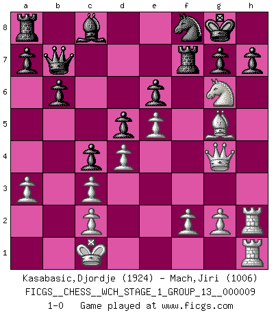 Last move : 1-0 2011 July 26 4:39:7 [Event "FICGS__CHESS__WCH_STAGE_1_GROUP_13__000009"] [Site "FICGS"] [Date "2011.04.01"] [Round "1"] [White "Kasabasic,Djordje"] [Black "Mach,Jiri"] [Result "1-0"] [WhiteElo "1924"] [BlackElo "1006"] 1.e4 e6 2.d4 d5 3.Nc3 Bb4 4.e5 c5 5.a3 Bxc3+ 6.bxc3 Ne7 7.Qg4 O-O 8.Bd3 c4 9.Bh6 Ng6 10.Bxg6 fxg6 11.Be3 Nc6 12.h4 Qe8 13.h5 gxh5 14.Rxh5 Ne7 15.Ne2 Rf5 16.Rh4 Ng6 17.Rh2 b6 18.Ng3 Rf7 19.O-O-O Nf8 20.Nh5 Kh8 21.Rdh1 Qe7 22.Bg5 Qb7 23.Nf4 Kg8 24.Ng6 1-0 French : Winawer, Advance, poisoned pawn variation Kingside Castling by player Black (move 7) Queenside Castling by player White (move 19) Player White won this chess game. Follow this game move after move (download)Mistrust is the most necessary characteristic of the Chess player. (Siegbert Tarrasch) Schach ist gnadenlos. Du mußt bereit sein zu töten. (Nigel Short) Un Peón pasado aumenta su poder a medida de que el número de piezas en el tablero disminuye. (Capablanca) Tout change constamment, y compris dans le monde des Echecs. (Botvinnik) Philosophers use a language that is already deformed as though by shoes that are too tight. (Ludwig Wittgenstein)