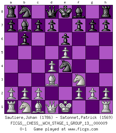 Last move : 0-1 2011 June 9 19:24:8 [Event "FICGS__CHESS__WCH_STAGE_1_GROUP_13__000009"] [Site "FICGS"] [Date "2011.04.01"] [Round "1"] [White "Sautiere,Johan"] [Black "Satonnet,Patrick"] [Result "0-1"] [WhiteElo "1786"] [BlackElo "1569"] 1.e4 e6 2.d4 b6 3.Nf3 Bb7 4.Bd3 Nf6 5.e5 Ne4 0-1 This chess game has been lost on time (started : 2011.04.01 10:29:47) French defense Player Black won this chess game. Follow this game move after move (download)With or without the title, Bobby Fischer was unquestionably the greatest player of his time. (Burt Hochberg) Ich verachte die Medien. (Robert James Fischer) Una partida de Ajedrez se divide en 3 etapas: la primera cuando piensas que tienes la ventaja, la segunda cuando crees que tienes la ventaja y la tercera... ¡cuando te das cuenta que vas a perder!. (Savielly Tartakower) Toutes les manuvres exécutées sur une colonne ouverte ont pour but ultime l'intrusion définitive sur la septième ou la huitième rangée, en plein cur de la position ennemie. (Aaron Nimzovitch) It is the aim of the modern school, not to treat every position according to one general law, but according to the principle inherent in the position. (Richard Reti)