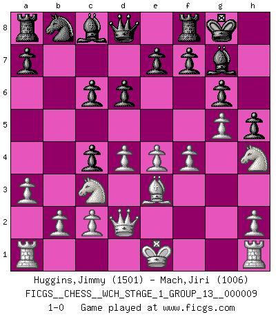 Last move : 1-0 2011 August 11 21:32:15 [Event "FICGS__CHESS__WCH_STAGE_1_GROUP_13__000009"] [Site "FICGS"] [Date "2011.04.01"] [Round "1"] [White "Huggins,Jimmy"] [Black "Mach,Jiri"] [Result "1-0"] [WhiteElo "1501"] [BlackElo "1006"] 1.e4 g6 2.d4 Bg7 3.Nc3 d6 4.f3 c6 5.Be3 Nf6 6.Qd2 b5 7.g4 h5 8.g5 Nfd7 9.f4 Nb6 10.Nf3 O-O 11.a3 Nc4 12.Bxc4 bxc4 13.Nh4 1-0 This chess game has been lost on time (started : 2011.04.01 10:29:47) Robatsch (Modern) defense Kingside Castling by player Black (move 10) Player White won this chess game. Follow this game move after move (download)Becoming successful at Chess allows you to discover your own personality. That's what I want for the kids I teach. (Saudin Robovic) Ein Isolani verdüstert die Stimmung auf dem ganzen Schachbrett. (Savielly Grigorievitsch Tartakower) No nos podemos resistir a la fascinación de un sacrificio ya que la pasión por los sacrificios es parte de la naturaleza de un jugador de Ajedrez. (Rudolf Spielman) Il vaut toujours mieux jouer un plan faux de façon logique que de n'avoir pas de plan du tout. (Victor Kortchnoï) Unless in communicating with it one says exactly what one means, trouble is bound to result. (Alan Turing, about computers)