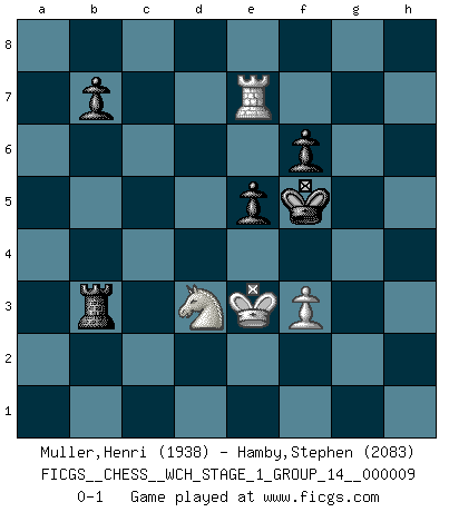 Last move : 0-1 2011 October 28 12:58:2 [Event "FICGS__CHESS__WCH_STAGE_1_GROUP_14__000009"] [Site "FICGS"] [Date "2011.04.01"] [Round "1"] [White "Muller,Henri"] [Black "Hamby,Stephen"] [Result "0-1"] [WhiteElo "1938"] [BlackElo "2083"] 1.e4 e6 2.d4 d5 3.Nc3 Nf6 4.Bg5 Be7 5.e5 Nfd7 6.Bxe7 Qxe7 7.f4 c5 8.Nb5 O-O 9.Nc7 cxd4 10.Nxa8 Qb4+ 11.Qd2 Qxb2 12.Rd1 Nc5 13.c4 Qa3 14.Nc7 a6 15.Bd3 dxc4 16.Bxc4 Nc6 17.Nf3 Ne4 18.Qc2 Qb4+ 19.Nd2 Nc3 20.Rc1 Qc5 21.Be2 Qb6 22.Nf3 Nb4 23.Qd2 Nbxa2 24.Na8 Qb4 25.Ra1 Bd7 26.Rxa2 Qb1+ 27.Bd1 Nxa2 28.Qxd4 Bc6 29.Nb6 Bxf3 30.gxf3 Nb4 31.O-O Nc6 32.Qc5 Qg6+ 33.Kh1 Qd3 34.Qf2 Qf5 35.Ba4 Nb4 36.Qd4 Qd3 37.Qxd3 Nxd3 38.Bc2 Nxf4 39.Rd1 g5 40.Kg1 Rb8 41.Kf2 Kg7 42.Rd7 Ng6 43.Bxg6 Kxg6 44.h3 h6 45.Ke3 a5 46.Ke2 a4 47.Rd4 a3 48.Ra4 Rd8 49.Rxa3 Rd4 50.Ra8 Rb4 51.Nd7 Rb2+ 52.Ke3 Rb3+ 53.Kf2 Rb2+ 54.Kg3 h5 55.h4 gxh4+ 56.Kxh4 Rd2 57.Nf6 Kf5 58.Kg3 Kxe5 59.Nxh5 Rd5 60.Nf4 Rb5 61.Rf8 Kf6 62.Rc8 e5 63.Nd3 Kg6 64.Rg8+ Kf5 65.Re8 f6 66.Re7 Kg6 67.Kf2 Kf5 68.Ke3 Rb3 0-1 This chess game has been lost on time (started : 2011.04.01 10:31:53) French : Classical, Steinitz variation Kingside Castling by player Black (move 8) Kingside Castling by player White (move 31) 10 pieces endgame at move 58 : White KRNP , Black KRPPPP WHITE : King + 1 Rook 1 Knight 1 Pawn BLACK : King + 1 Rook 4 Pawns 9 pieces endgame at move 59 : White KRNP , Black KRPPP WHITE : King + 1 Rook 1 Knight 1 Pawn BLACK : King + 1 Rook 3 Pawns Player Black won this chess game. Follow this game move after move (download)Spassky will not be psyched out by Fischer. (Mike Goodall) Ein Springer auf f6 gegen die eigene Rochadestellung ist schlimmer als ein rostiger Nagel im Knie. (Efim Bogoljubov) En el tablero, la mentira e hipocresía no sobreviven mucho. (Emanuel Lasker) A chaque perte on perd un peu de soi. (Joël Lautier) Don't be irreplaceable, if you can't be replaced, you can't be promoted. (Dan Rotaru)