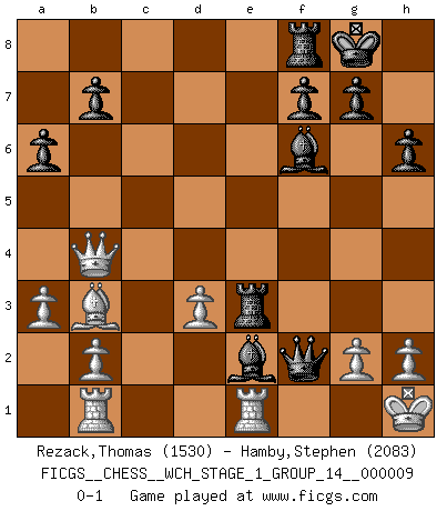 Last move : 0-1 2011 June 25 12:38:6 [Event "FICGS__CHESS__WCH_STAGE_1_GROUP_14__000009"] [Site "FICGS"] [Date "2011.04.01"] [Round "1"] [White "Rezack,Thomas"] [Black "Hamby,Stephen"] [Result "0-1"] [WhiteElo "1530"] [BlackElo "2083"] 1.e4 c5 2.Nf3 d6 3.d4 cxd4 4.Nxd4 Nf6 5.Nc3 a6 6.Bc4 e6 7.Bg5 Be7 8.a3 O-O 9.f4 h6 10.Bxf6 Bxf6 11.O-O Qb6 12.Nce2 e5 13.fxe5 dxe5 14.Kh1 exd4 15.Bb3 Bg4 16.Qd3 Nd7 17.Rab1 Nc5 18.Qd2 Nxe4 19.Qf4 Bxe2 20.Rfe1 d3 21.Qxe4 Rae8 22.Qb4 Qf2 23.cxd3 Re3 0-1 Sicilian : Najdorf, Lipnitzky attack Kingside Castling by player Black (move 8) Kingside Castling by player White (move 11) Player Black won this chess game. Follow this game move after move (download)We like to think. (Gary Kasparov) Ich tröste mich mit dem Vergnügen, daß Schachfans, Zuschauer und Leser glücklich sind, wenn ein Großmeister etwas riskiert, statt nur Klötzchen zu schieben. (Mikhail Nekhemyevich Tal) Muchos se han convertido en Maestros de Ajedrez, nadie se ha convertido en el Maestro del Ajedrez. (Siegbert Tarrasch) Horreur, mais aussi harmonie suprême : qu'y avait-il en effet au monde en dehors des échecs ? Le brouillard, l'inconnu, le non-être... (Vladimir Nabokov) The next best thing to gambling and winning is gambling and loosing. (Nick Dandalos)