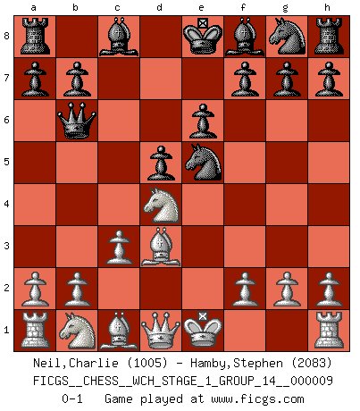 Last move : 0-1 2011 May 10 8:37:12 [Event "FICGS__CHESS__WCH_STAGE_1_GROUP_14__000009"] [Site "FICGS"] [Date "2011.04.01"] [Round "1"] [White "Neil,Charlie"] [Black "Hamby,Stephen"] [Result "0-1"] [WhiteElo "1005"] [BlackElo "2083"] 1.e4 e6 2.d4 d5 3.e5 c5 4.c3 Nc6 5.Nf3 Qb6 6.Bd3 cxd4 7.Nxd4 Nxe5 0-1 French : Advance, Milner-Barry gambit Player Black won this chess game. Follow this game move after move (download)Chess mastery essentially consists of analyzing Chess positions accurately. (Mikhail Botvinnik) Man kann eine Schachpartie nur gewinnen, wenn das Gleichgewicht gestört ist. In einer Stellung mit ungestörtem Gleichgewicht ist auch das größte Genie hilflos - in der Stellung steckt dann eben kein genialer Einfall. (Wilhelm Steinitz) La batalla por la última verdad nunca sera ganada. Y es por eso que el Ajedrez es tan fascinante. (Hans Kmoch) J'apprécie les joueurs d'est-indienne, c'est grâce à eux que je nourris ma famille depuis tant d'années. (Petrosian) Men never do evil so completely and cheerfully as when they do it from religious conviction. (Blaise Pascal)