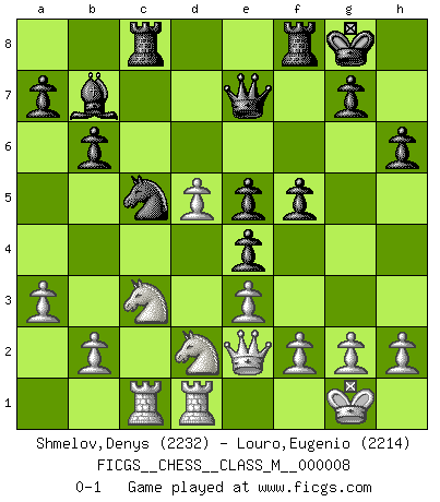 Last move : 0-1 2007 April 20 17:54:17 [Event "FICGS__CHESS__CLASS_M__000008"] [Site "FICGS"] [Date "2006.12.16"] [Round "1"] [White "Shmelov,Denys"] [Black "Louro,Eugenio"] [Result "0-1"] [WhiteElo "2232"] [BlackElo "2214"] 1.d4 Nf6 2.c4 e6 3.Nc3 d5 4.Bg5 Be7 5.Nf3 h6 6.Bh4 O-O 7.e3 Nbd7 8.Rc1 c6 9.Bd3 b6 10.cxd5 cxd5 11.O-O Bb7 12.Qe2 Ne4 13.Bxe7 Qxe7 14.Bxe4 dxe4 15.Nd2 f5 16.Rfd1 Rac8 17.a3 e5 18.d5 Nc5 0-1 This chess game has been lost on time (started : 2006.12.16 17:16:4) Queen's pawn game Kingside Castling by player Black (move 6) Kingside Castling by player White (move 11) Player Black won this chess game. Follow this game move after move (download)The essence of Chess is thinking about what Chess is. (David Bronstein) Kasparov ist eine Art Monster mit hundert Augen, denen auch nicht das Geringste entgeht. (Tony Miles) Nunca nadie ha ganado una partida de Ajedrez rindiendose. (Unknown) L'action d'une oeuvre littéraire se déroule sur un champ de bataille. Les masques et les types du drame moderne correspondent aux pièces du jeu d'échecs. L'intrigue correspond aux coups et aux gambits, c'est à dire aux techniques du jeu telles qu'utilisées et interprétées par les joueurs. Les tactiques et les péripéties [mouvements] correspondent aux coups exécutés par l'adversaire. (Viktor Shklovsky) If I had no sense of humor, I would long ago have committed suicide. (Mahatma Gandhi)