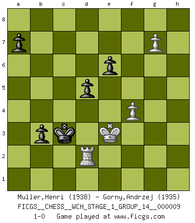 Last move : 1-0 2011 July 14 12:56:12 [Event "FICGS__CHESS__WCH_STAGE_1_GROUP_14__000009"] [Site "FICGS"] [Date "2011.04.01"] [Round "1"] [White "Muller,Henri"] [Black "Gorny,Andrzej"] [Result "1-0"] [WhiteElo "1938"] [BlackElo "1935"] 1.e4 e6 2.d4 d5 3.Nc3 Bb4 4.e5 c5 5.a3 Bxc3+ 6.bxc3 Ne7 7.Qg4 Qc7 8.Qxg7 Rg8 9.Qxh7 cxd4 10.Ne2 Nbc6 11.f4 Bd7 12.Qd3 dxc3 13.h4 O-O-O 14.h5 Nf5 15.Qxc3 Rg4 16.Bd2 Rh8 17.Qf3 Ncd4 18.Nxd4 Nxd4 19.Qxg4 Nxc2+ 20.Kf2 Nxa1 21.Qg7 Rd8 22.Bb4 Qc1 23.Qg3 Nc2 24.Qc3+ Kb8 25.Qd2 Qxd2+ 26.Bxd2 Nxa3 27.Bb4 Nb5 28.h6 Rh8 29.h7 Nc7 30.Rh3 Ne8 31.Bd3 Kc7 32.Rg3 f5 33.exf6 Nxf6 34.Bc3 Rxh7 35.Bxh7 Nxh7 36.Rg7 Nf8 37.Rg8 Nh7 38.Rh8 Nf8 39.Rxf8 Ba4 40.g4 Bc2 41.Rf7+ Kc6 42.Re7 Kc5 43.Ke3 b5 44.Rc7+ Kb6 45.Ba5+ Kxa5 46.Rxc2 b4 47.g5 b3 48.Rd2 Kb4 49.g6 Kc3 50.g7 1-0 French : Winawer, Advance, poisoned pawn variation Queenside Castling by player Black (move 13) 10 pieces endgame at move 45 : White KRPP , Black KBPPPP WHITE : King + 1 Rook 2 Pawns BLACK : King + 1 Bishop 4 Pawns 9 pieces endgame at move 46 : White KRPP , Black KPPPP WHITE : King + 1 Rook 2 Pawns BLACK : King + 4 Pawns Player White won this chess game. Follow this game move after move (download)If cunning alone were needed to excel, women would be the best Chess players. (Albin) Der Verteidiger gebe der Gewalt nach, aber nur der Gewalt. Er schaffe sich nicht freiwillig, etwa aus Blindheit oder aus Schrecken, irgendwelche Schwächen. Er lasse sich nicht bluffen. (Emanuel Lasker) Hasta este punto, las blancas han seguido un análisis bien conocido. Pero ahora el hace un error fatal: empieza a usar su propia cabeza. (Siegbert Tarrasch) Assurément je connaissais par expérience le mystérieux attrait de ce jeu royal, le seul entre tous les jeux inventés par les hommes qui échappe souverainement à la tyrannie du hasard, le seul où l'on ne doive sa victoire qu'à son intelligence ou plutôt à une certaine forme d'intelligence. Mais n'est-ce pas déjà le limiter injurieusement que d'appeler les échecs un jeu ? N'est-ce pas une science, un art ou quelque chose qui, comme le cercueil de Mahomet entre ciel et terre, est suspendu entre l'un et l'autre, et qui réunit un nombre incroyable de contraires ? [...] C'est une pensée qui ne mène à rien, une mathématique qui n'établit rien, un art qui ne laisse pas d'uvre, une architecture sans matière; et il l'a prouvé néanmoins qu'il était plus durable, à sa manière, que les livres ou que tout autre monument, ce jeu unique qui appartient à tous les peuples et à tous les temps, et dont personne ne sait quel dieu en fit don à la terre pour tuer l'ennui, pour aiguiser l'esprit et stimuler l'âme. Où commence-t-il, où finit-il ? (Stefan Zweig) Everybody lies. (Gregory House, House M.D.)