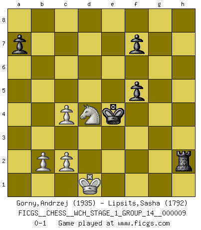 Last move : 0-1 2011 July 17 20:24:12 [Event "FICGS__CHESS__WCH_STAGE_1_GROUP_14__000009"] [Site "FICGS"] [Date "2011.04.01"] [Round "1"] [White "Gorny,Andrzej"] [Black "Lipsits,Sasha"] [Result "0-1"] [WhiteElo "1935"] [BlackElo "1792"] 1.d4 d5 2.Bg5 Nf6 3.Nc3 Nbd7 4.Qd2 h6 5.Bh4 c6 6.O-O-O b5 7.f3 e6 8.Re1 Be7 9.e4 b4 10.Nd1 Qa5 11.Kb1 Nxe4 12.Rxe4 dxe4 13.Bxe7 Kxe7 14.fxe4 Rd8 15.h4 c5 16.g4 Bb7 17.d5 exd5 18.Qf4 b3 19.axb3 Qe1 20.Be2 dxe4 21.Qh2 Qd2 22.Nc3 Qd6 23.Qf2 Kf8 24.Qe3 Ne5 25.g5 Rac8 26.Nh3 Nf3 27.Bxf3 exf3 28.gxh6 Qxh6 29.Ng5 Rc7 30.Rf1 Re7 31.Qxc5 Qxh4 32.Qf5 g6 33.Nxf3 Re1+ 34.Rxe1 Qxe1+ 35.Nxe1 gxf5 36.Nd3 Ke7 37.Kc1 Rh8 38.Ne2 Rh2 39.Nd4 Be4 40.Ne5 Kf6 41.Nd7+ Kg5 42.Ne5 Kf4 43.Nc4 Bd5 44.Kd1 Bxc4 45.bxc4 Ke4 0-1 This chess game has been lost on time (started : 2011.04.01 10:31:53) Levitsky attack (Queen's Bishop attack) Queenside Castling by player White (move 6) 10 pieces endgame at move 45 : White KNPPP , Black KRPPP WHITE : King + 1 Knight 3 Pawns BLACK : King + 1 Rook 3 Pawns Player Black won this chess game. Follow this game move after move (download)I thought the most common mistake [in chess] was the first one: Learning the game :P (Garvin Gray, FICGS forum) Das Zentrum ist der Balkan des Schachbretts - Kriegshandlungen können in jedem Moment ausbrechen. (Aaron Nimzowitsch) Las combinaciones han sido siempre el aspecto más intrigante del Ajedrez. Los Maestros las buscan, el público las aplauden, los críticos las alaban. La razón se debe a que las combinaciones hacen posible que el Ajedrez sea más que un ejercicio matemático con una carencia de vida. Ellas son la poesía del juego, son del Ajedrez lo que la melodía es de la música. Ellas representan el triunfo de la mente sobre la materia. (Reuben Fine) Nous sommes les pions de la mystérieuse partie d'Echecs jouée par Dieu. Il nous déplace, nous arrête, nous pousse encore, puis nous lance un à un dans la boîte du Néant. Epitaphe sur la tombe de David Janowsky (1868-1927). I don't diet. I just don't eat as much as I'd like to. (Linda Evangelista, supermodel)
