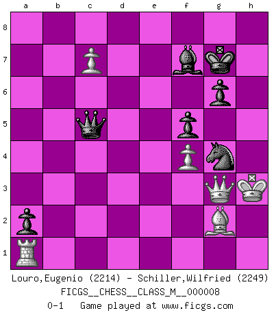 Last move : 0-1 2008 March 28 0:6:18 [Event "FICGS__CHESS__CLASS_M__000008"] [Site "FICGS"] [Date "2006.12.16"] [Round "1"] [White "Louro,Eugenio"] [Black "Schiller,Wilfried"] [Result "0-1"] [WhiteElo "2214"] [BlackElo "2249"] 1.c4 e5 2.Nc3 Nf6 3.Nf3 Nc6 4.g3 Nd4 5.Bg2 Nxf3+ 6.Bxf3 Bc5 7.a3 d6 8.d3 O-O 9.Na4 c6 10.Nxc5 dxc5 11.Bg2 Bf5 12.O-O a5 13.Bd2 Qd7 14.Bc3 Rfe8 15.Re1 Bh3 16.Bh1 a4 17.b4 axb3 18.Qxb3 Re7 19.a4 Qd6 20.a5 Bf5 21.Qb2 Ra7 22.Bg2 Nd7 23.Ra3 f6 24.Rb3 Nf8 25.Rb1 Bc8 26.Qd2 Qd8 27.Rb6 Qe8 28.e3 Ne6 29.f4 exf4 30.gxf4 Ra8 31.Rf1 Nf8 32.Rf3 Ng6 33.Rg3 Qf7 34.Qf2 Rd7 35.Qf1 Re7 36.Be4 f5 37.Bg2 Qf8 38.Qf2 Qd8 39.Bf1 Qe8 40.h4 Nxh4 41.Bf6 Ng6 42.Bxe7 Qxe7 43.Qd2 Nf8 44.Rb2 Nd7 45.Bg2 Nf6 46.Rb6 Qd8 47.Qc3 Ng4 48.Bh3 h5 49.Rf3 g6 50.Kh1 Kf7 51.Kg1 Kg8 52.Bg2 Qh4 53.Rb2 Qd8 54.Ra2 b6 55.Rh3 Qd6 56.Bf1 Qd8 57.d4 Rxa5 58.Rxa5 bxa5 59.dxc5 a4 60.Be2 Be6 61.Kg2 Qe7 62.Qd4 Kf7 63.Kg3 Qb7 64.Rh1 Nf6 65.Bf3 a3 66.Ra1 Qb3 67.Bxc6 a2 68.Qe5 Qxc4 69.Qc7+ Kf8 70.Qe5 Kg7 71.Bg2 Kf7 72.Qc7+ Kf8 73.Qb8+ Kg7 74.Qe5 Kf7 75.Qc7+ Kf8 76.Qd6+ Kf7 77.c6 h4+ 78.Kh2 Qc2 79.Qc7+ Kg8 80.Qd8+ Kg7 81.Qe7+ Bf7 82.c7 Ng4+ 83.Kh3 Qf2 84.Qxh4 Qxe3+ 85.Qg3 Qc5 0-1 English Opening Kingside Castling by player Black (move 8) Kingside Castling by player White (move 12) Player Black won this chess game. Follow this game move after move (download)The chessboard is the world, the pieces are the phenomena of the Universe, the rules of the game are what we call the laws of Nature and the player on the other side is hidden from us. (Thomas Huxley) Modernes Schach sorgt sich zuviel um Dinge wie Bauernstruktur usw. Vergessen Sie das, Schachmatt beendet das Spiel! (Nigel Short) Tu eres para mi la Reina en d8 y yo soy el Peón en d7!!. (GM Eduard Gufeld) A ce moment-là, je menaçais de comprendre la position ! (Clément L'Heureux) It's not the size of the dog in the fight, it's the size of the fight in the dog. (Mark Twain)