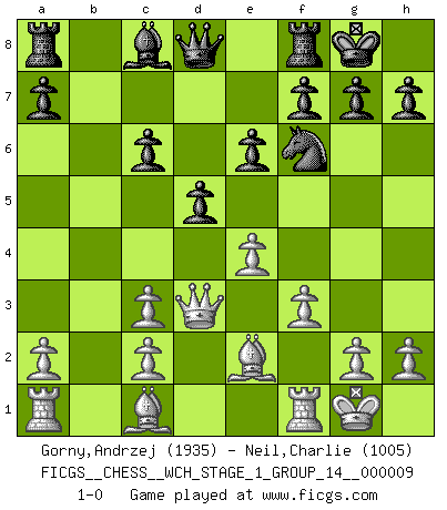 Last move : 1-0 2011 April 25 10:54:30 [Event "FICGS__CHESS__WCH_STAGE_1_GROUP_14__000009"] [Site "FICGS"] [Date "2011.04.01"] [Round "1"] [White "Gorny,Andrzej"] [Black "Neil,Charlie"] [Result "1-0"] [WhiteElo "1935"] [BlackElo "1005"] 1.e4 c5 2.Nf3 Nc6 3.d4 cxd4 4.Nxd4 Nf6 5.Nc3 e6 6.Be2 Bb4 7.O-O O-O 8.Qd3 Bxc3 9.Nxc6 bxc6 10.bxc3 d5 11.f3 1-0 Sicilian defense Kingside Castling by player White (move 7) Kingside Castling by player Black (move 7) Player White won this chess game. Follow this game move after move (download)I had a toothache during the first game. In the second game I had a headache. In the third game it was an attack of rheumatism. In the fourth game, I wasn't feeling well. And in the fifth game? Well, must one have to win every game ? (Siegbert Tarrasch) Über Karpov: Er war und ist ein Vertreter der russischen Reaktionäre. Das steckt tief in seiner Seele, wehalb ich nicht nett mit ihm umgehen kann. (Viktor Kortschnoi) Siempre es mucho mejor sacrificar las piezas de tu oponente. (Savielly Tartakover) Horreur, mais aussi harmonie suprême : qu'y avait-il en effet au monde en dehors des échecs ? Le brouillard, l'inconnu, le non-être... (Vladimir Nabokov) A good player is always lucky. (Capablanca)