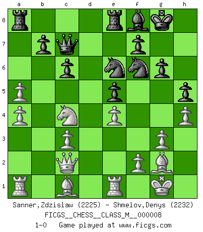 Last move : 1-0 2007 April 13 16:55:37 [Event "FICGS__CHESS__CLASS_M__000008"] [Site "FICGS"] [Date "2006.12.16"] [Round "1"] [White "Sanner,Zdzislaw"] [Black "Shmelov,Denys"] [Result "1-0"] [WhiteElo "2225"] [BlackElo "2232"] 1.e4 c6 2.d3 d5 3.Nd2 e5 4.Ngf3 Bd6 5.g3 Nf6 6.Bg2 O-O 7.O-O Re8 8.Re1 Nbd7 9.c3 dxe4 10.dxe4 Qc7 11.b4 a5 12.Nc4 Bf8 13.bxa5 Nc5 14.Qc2 g6 15.a4 Bg4 16.h3 Bxf3 17.Bxf3 Ne6 18.h4 h5 19.Bg2 1-0 This chess game has been lost on time (started : 2006.12.16 17:16:4) Caro-Kann : Closed (Breyer) variation Kingside Castling by player Black (move 6) Kingside Castling by player White (move 7) Player White won this chess game. Follow this game move after move (download)For surely of all the drugs in the world, Chess must be the most permanently pleasurable. (Assiac) Schach ist Kampf, hauptsächlich jedoch gegen die eigenen Fehler. (Savielly Grigorievitsch Tartakower) Los Peones son el alma de una partida de Ajedrez. (Francois Andre Danican Philidor) Les erreurs sont comme les malheurs, elles n'arrivent jamais seules. (Siegbert Tarrasch) Memory is a complicated thing, a relative to truth, but not its twin. (Barbara Kingsolver, Animal Dreams)