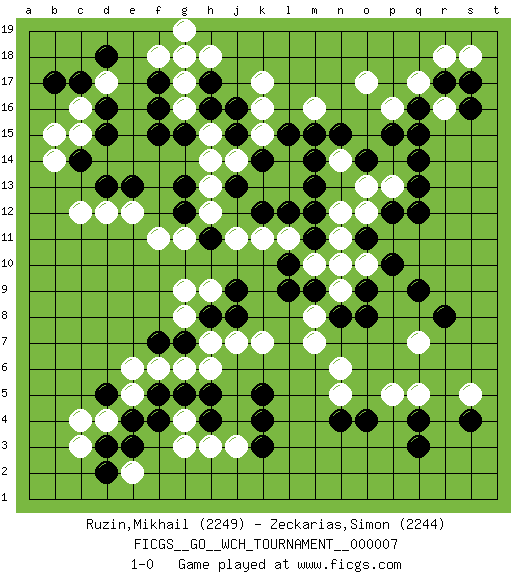 Last move : 1-0 2011 June 6 14:40:4 [Event "FICGS__GO__WCH_TOURNAMENT__000007"] [Site "FICGS"] [Date "2011.04.01"] [Round "1"] [Black "Ruzin,Mikhail"] [White "Zeckarias,Simon"] [Result "1-0"] [Rating 1 "2249"] [Rating 2 "2244"] 1.q16 d17 2.q3 d4 3.q9 o17 4.q14 k16 5.k4 q5 6.q4 p5 7.n4 q7 8.r8 s5 9.s4 n6 10.o8 m7 11.m9 n9 12.n8 m8 13.l9 n10 14.o9 k7 15.m12 n12 16.m11 o10 17.p10 o12 18.q12 n14 19.k14 m16 20.d15 d12 21.g15 g17 22.f17 f18 23.g18 h18 24.h17 g16 25.h16 g19 26.f16 g18 27.f15 h15 28.j15 h14 29.j16 k17 30.g12 h12 31.g13 h13 32.h11 k13 33.m14 l13 34.m13 l14 35.n15 g11 36.d13 e12 37.e13 f11 38.j9 h7 39.m15 c12 40.c17 c16 41.d16 c15 42.c14 b14 43.b17 q17 44.l15 k15 45.r17 p16 46.p15 r16 47.q15 r18 48.s17 s18 49.s16 h3 50.h4 g4 51.h5 j3 52.k3 h9 53.j8 j7 54.h8 g8 55.g7 g6 56.f7 h6 57.g5 f6 58.f4 g3 59.f5 e2 60.d5 e5 61.e4 e6 62.d3 c4 63.e3 c3 64.d2 g9 65.k5 m10 66.l10 l11 67.l12 k11 68.k12 j11 69.j13 b15 70.d18 n5 71.o4 j14 72.o11 n11 73.p12 o13 74.o14 p13 75.q13 1-0 Here are the names of the openings (joseki) played in the four corners : Corner q16 : q16 o17 Hoshi (Hwajeom, Seongjeom, Xingwei`) 4-4 Point. The star or hoshi (4-4) point, emphasizing influence at the potential expense of territory. Ikken Kakari (Hankan Keolch'im, Yi Gua`jiao~, 1-Space Low Approach). White 2 is the standard approach move to the 4-4. Corner d16 : d17 d15 Komoku (Somok, Xiao~mu`) 3-4 Point. The komoku (3-4) point is the traditional corner enclosure move.. Ikken Takagakari (Hankan Nop'dakeolch'im, Yi Gaogua`jiao~, 1-Space High Approach). The 5-4 approach move has become more popular in modern times, as modern Go emphasizes speed and influence. Corner d4 : d4 j9 Hoshi (Hwajeom, Seongjeom, Xingwei`) 4-4 Point. The star or hoshi (4-4) point, emphasizing influence at the potential expense of territory. Player Black won this Go (weiqi, baduk) game. Follow this game move after move (download)Eyes win semiais. (Anonymous) The project of the man are lower than those of the sky. (Chinese proverb)