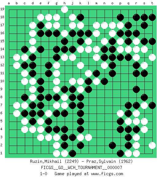 Last move : 1-0 2011 August 8 13:58:17 [Event "FICGS__GO__WCH_TOURNAMENT__000007"] [Site "FICGS"] [Date "2011.04.01"] [Round "1"] [Black "Ruzin,Mikhail"] [White "Praz,Sylvain"] [Result "1-0"] [Rating 1 "2249"] [Rating 2 "1962"] 1.q16 d4 2.q3 d17 3.r9 c11 4.k4 o17 5.o15 m16 6.n16 n17 7.m15 l15 8.l16 m17 9.k15 l14 10.k16 k14 11.j14 j13 12.h14 k12 13.p18 p15 14.p16 o16 15.o14 n15 16.n14 m14 17.o11 h16 18.g16 h13 19.g14 d15 20.g13 g12 21.d13 c13 22.c14 d14 23.c12 b13 24.d12 b12 25.d11 d10 26.e10 c10 27.f12 g11 28.f11 g10 29.e9 q5 30.p5 p6 31.p4 r3 32.q4 r5 33.r4 s5 34.r7 s4 35.q6 r2 36.q2 s7 37.s8 r6 38.q7 q1 39.p1 r1 40.o2 p14 41.p13 o13 42.n13 r15 43.q15 q14 44.q13 r14 45.r16 r13 46.r12 s12 47.r11 s16 48.s17 r17 49.r18 t17 50.s18 s14 51.t15 t16 52.s11 t13 53.t7 t2 54.t18 f3 55.s15 c5 56.k7 k3 57.j3 j4 58.h4 j5 59.h3 h5 60.g4 g5 61.f4 e3 62.f5 h8 63.k5 j6 64.j7 h7 65.k6 d8 66.l10 n12 67.o12 m13 68.o13 m10 69.m11 l11 70.n10 k10 71.l9 k9 72.k8 g17 73.f16 f17 74.e16 d16 75.e17 e18 76.h17 f18 77.k18 j17 78.h18 j18 79.j16 h19 80.h15 g18 81.e14 p17 82.q17 g2 83.h2 h16 84.e8 k17 85.d7 c7 86.c8 d9 87.c6 b7 88.d6 b6 89.d5 c4 90.j9 j10 91.h9 g9 92.g8 g7 93.f8 f6 94.j8 e5 95.e7 e4 96.e6 h1 97.j1 g1 98.k2 l3 99.g6 g3 100.h6 1-0 Here are the names of the openings (joseki) played in the four corners : Corner q16 : q16 o17 Hoshi (Hwajeom, Seongjeom, Xingwei`) 4-4 Point. The star or hoshi (4-4) point, emphasizing influence at the potential expense of territory. Ikken Kakari (Hankan Keolch'im, Yi Gua`jiao~, 1-Space Low Approach). White 2 is the standard approach move to the 4-4. Corner d4 : d4 e9 Hoshi (Hwajeom, Seongjeom, Xingwei`) 4-4 Point. The star or hoshi (4-4) point, emphasizing influence at the potential expense of territory. Player Black won this Go (weiqi, baduk) game. Follow this game move after move (download)Those who are good at winning, don't usually fight. (Zhang) Follow your passion, and success will follow you. (Arthur Buddhold)
