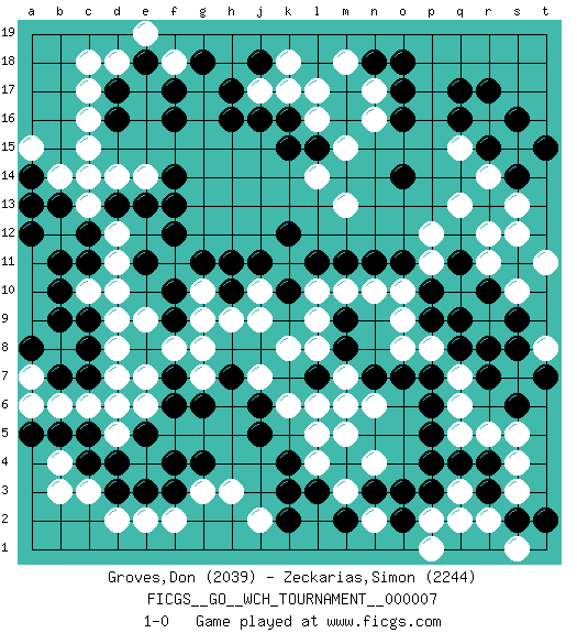 Last move : 1-0 2011 June 8 12:35:34 [Event "FICGS__GO__WCH_TOURNAMENT__000007"] [Site "FICGS"] [Date "2011.04.01"] [Round "1"] [Black "Groves,Don"] [White "Zeckarias,Simon"] [Result "1-0"] [Rating 1 "2039"] [Rating 2 "2244"] 1.q17 q15 2.d4 r5 3.d16 c10 4.k16 c14 5.f16 l16 6.l15 k17 7.k4 l17 8.o16 m15 9.o14 r12 10.j16 l14 11.k15 n16 12.o17 j17 13.h16 n17 14.p4 q3 15.p3 q2 16.p6 q5 17.p5 c6 18.f4 e6 19.g6 r16 20.r17 p2 21.n3 c3 22.c4 b4 23.b5 b3 24.c5 e2 25.h17 g3 26.g4 h3 27.f3 f2 28.d3 d2 29.c12 b12 30.b13 c13 31.b11 d12 32.c11 d11 33.b10 d9 34.c9 d10 35.c8 b14 36.a12 c17 37.d13 e14 38.e13 d14 39.f13 g10 40.f14 c16 41.j11 j10 42.k10 j9 43.h11 k8 44.h10 h9 45.f7 d8 46.f9 g9 47.f10 f11 48.g11 f8 49.e11 e9 50.f12 g7 51.h7 g8 52.f6 e7 53.m8 m7 54.l7 l8 55.m9 l6 56.j6 k6 57.n7 l10 58.m6 k11 59.k12 m10 60.l11 l9 61.m11 n10 62.p10 j7 63.j5 m5 64.c7 b6 65.d6 d7 66.b7 a6 67.a5 d5 68.m4 p11 69.q11 q10 70.o11 o10 71.p9 p12 72.n11 o8 73.q8 q7 74.p7 p8 75.r10 r11 76.q9 o9 77.r7 q6 78.s11 s12 79.s9 s7 80.r8 t11 81.s6 s5 82.t7 l4 83.l3 l5 84.k3 n4 85.o2 m3 86.m2 n6 87.o7 m7 88.q4 s3 89.m6 a7 90.a8 m7 91.r4 s4 92.s16 s15 93.q16 s10 94.q12 q13 95.m6 d6 96.b9 q10 97.q11 m7 98.r3 r2 99.m6 e4 100.e3 m7 101.s2 s1 102.m6 t8 103.s8 m7 104.n18 m18 105.m6 n2 106.o3 m7 107.r15 m6 108.s14 s13 109.e5 r14 110.t15 j2 111.k2 m13 112.d17 d18 113.e18 c18 114.a14 a15 115.a13 c15 116.o18 f18 117.t2 p1 118.f17 e19 119.j18 k18 120.g18 1-0 Here are the names of the openings (joseki) played in the four corners : Corner q16 : q17 q15 Komoku (Somok, Xiao~mu`) 3-4 Point. The komoku (3-4) point is the traditional corner enclosure move.. Ikken Takagakari (Hankan Nop'dakeolch'im, Yi Gaogua`jiao~, 1-Space High Approach). The 5-4 approach move has become more popular in modern times, as modern Go emphasizes speed and influence. Corner d16 : d16 c14 Hoshi (Hwajeom, Seongjeom, Xingwei`) 4-4 Point. The star or hoshi (4-4) point, emphasizing influence at the potential expense of territory. Ikken Kakari (Hankan Keolch'im, Yi Gua`jiao~, 1-Space Low Approach). White 2 is the standard approach move to the 4-4. Corner q4 : r5 p4 Mokuhazushi (Waemok, Wai`mu`) 5-3 Point. The mokuhazushi (5-3) point was popular in the Edo period in Japan (1600 - 1867). It emphasizes influence; territorially, it is inferior to the 3-4 point. Takamoku Kakari. Black prevents White from gaining influence, but in the local context, abandoning profit in the corner entails a loss. White 3-4 and 4-4 are best. Corner d4 : d4 c6 Hoshi (Hwajeom, Seongjeom, Xingwei`) 4-4 Point. The star or hoshi (4-4) point, emphasizing influence at the potential expense of territory. Ikken Kakari (Hankan Keolch'im, Yi Gua`jiao~, 1-Space Low Approach). White 2 is the standard approach move to the 4-4. Player Black won this Go (weiqi, baduk) game. Follow this game move after move (download)When you study joseki, you lose two stones in strength. (Anonymous) Luck is the residue of design. (John Milton)