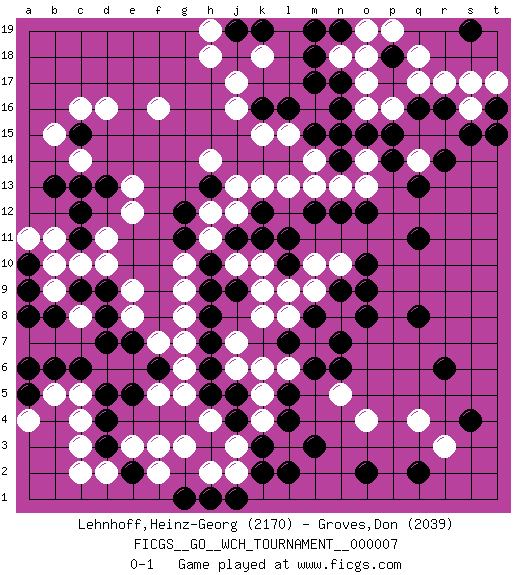 Last move : 0-1 2011 July 27 1:7:26 [Event "FICGS__GO__WCH_TOURNAMENT__000007"] [Site "FICGS"] [Date "2011.04.01"] [Round "1"] [Black "Lehnhoff,Heinz-Georg"] [White "Groves,Don"] [Result "0-1"] [Rating 1 "2170"] [Rating 2 "2039"] 1.q16 q4 2.d3 d16 3.c6 q14 4.q11 o16 5.p15 r17 6.r16 q17 7.p14 p16 8.q13 s16 9.s15 s17 10.r14 k4 11.m17 j17 12.m15 d11 13.r6 o4 14.s4 r3 15.q8 f3 16.d13 f16 17.m3 n5 18.c15 c16 19.k3 j3 20.j4 h4 21.j5 l3 22.k2 j2 23.l4 k5 24.l5 k6 25.l2 j6 26.o2 l6 27.q2 e12 28.m6 c8 29.n6 c4 30.d4 c5 31.d5 c3 32.f6 d2 33.h5 g5 34.h6 g6 35.h7 g7 36.h8 g3 37.d7 k8 38.j9 k9 39.j11 k10 40.k11 j10 41.h10 h11 42.g11 h12 43.g12 j13 44.h13 j12 45.l11 g10 46.h9 g9 47.e2 c2 48.d8 g8 49.c9 b11 50.b8 l13 51.n14 n18 52.m12 h14 53.n17 o17 54.p18 o18 55.m18 m9 56.n9 n8 57.o8 n10 58.o9 m10 59.b13 b15 60.c11 c10 61.c12 b9 62.d9 d10 63.b6 e3 64.a8 c14 65.j19 k18 66.k19 h18 67.l7 j7 68.s19 q18 69.m8 b5 70.n19 o19 71.c13 e13 72.j1 h19 73.g1 f2 74.m19 m13 75.o12 n13 76.n12 o14 77.o15 o13 78.n16 m14 79.n15 l15 80.l16 k15 81.k16 j16 82.a9 b10 83.a5 a4 84.a6 e9 85.a10 a11 86.e7 e8 87.o10 l8 88.n7 p19 89.l10 l9 90.t16 t17 91.t15 h2 92.h1 f5 93.e5 f7 94.k12 k13 0-1 Thibault de Vassal Good game gentlemen... Here are the names of the openings (joseki) played in the four corners : Corner q16 : q16 q14 Hoshi (Hwajeom, Seongjeom, Xingwei`) 4-4 Point. The star or hoshi (4-4) point, emphasizing influence at the potential expense of territory. Ikken Takagakari (Hankan Nop'dakeolch'im, Yi Gaojia, 1-Space High Approach). Black typically responds at 6-4 or 3-10. Black 4-10 is played when Black finds play on the right side advantageous. Black 4-8 or 3-8 may be played when Black has support at top. Corner q4 : q4 r6 Hoshi (Hwajeom, Seongjeom, Xingwei`) 4-4 Point. The star or hoshi (4-4) point, emphasizing influence at the potential expense of territory. Ikken Kakari (Hankan Keolch'im, Yi Gua`jiao~, 1-Space Low Approach). Black 2 is the standard approach move to the 4-4. Player White won this Go (weiqi, baduk) game. Follow this game move after move (download)The comb formation is alive. (Anonymous) A good teacher is like a candle - it consumes itself to light the way for others. (Author unknown)