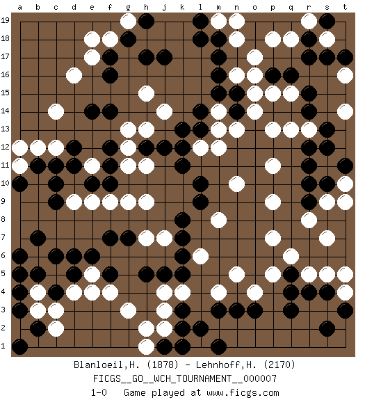 Last move : 1-0 2012 January 8 14:21:18 [Event "FICGS__GO__WCH_TOURNAMENT__000007"] [Site "FICGS"] [Date "2011.04.01"] [Round "1"] [Black "Blanloeil,Hugues"] [White "Lehnhoff,Heinz-Georg"] [Result "1-0"] [Rating 1 "1878"] [Rating 2 "2170"] 1.q16 d4 2.q3 d16 3.f17 c14 4.j17 o17 5.m17 e17 6.f16 q18 7.r17 p15 8.r14 p13 9.r12 r5 10.q5 q6 11.r4 s5 12.s4 p5 13.q4 p7 14.n3 n13 15.r9 g3 16.k3 n5 17.c6 c5 18.d6 s7 19.c10 b6 20.b7 f18 21.g18 e18 22.h17 t10 23.s10 j2 24.k2 j3 25.k5 k1 26.l2 p9 27.d12 d9 28.c9 f9 29.f5 f4 30.f7 b12 31.e14 h9 32.l10 p11 33.k8 h7 34.h5 h11 35.k12 e11 36.d11 r13 37.s13 q15 38.r15 q13 39.e10 h13 40.j12 j14 41.h12 g12 42.f11 g11 43.f12 g13 44.l14 e9 45.f10 g9 46.g7 j7 47.k7 s18 48.r18 r19 49.s17 p18 50.p16 o16 51.n15 o15 52.n14 m13 53.l13 j4 54.j5 s11 55.r11 s9 56.r10 r8 57.b5 o14 58.b11 l12 59.k11 h15 60.f14 b4 61.a6 t14 62.s12 n16 63.m16 t16 64.t17 n18 65.m18 m12 66.k13 m8 67.l9 t4 68.t3 t5 69.s2 m19 70.l19 n19 71.l18 l6 72.k6 l1 73.m1 c12 74.c11 o4 75.o3 e5 76.e6 m4 77.m3 a11 78.a10 a12 79.j1 h1 80.k1 h2 81.d5 e4 82.c4 c3 83.a4 b3 84.a3 a2 85.a5 n10 86.b2 c2 87.a1 m14 88.m15 k4 89.t11 t9 90.s19 g19 91.h19 1-0 Here are the names of the openings (joseki) played in the four corners : Corner d16 : d16 f17 Hoshi (Hwajeom, Seongjeom, Xingwei`) 4-4 Point. The star or hoshi (4-4) point, emphasizing influence at the potential expense of territory. Ikken Kakari (Hankan Keolch'im, Yi Gua`jiao~, 1-Space Low Approach). Black 2 is the standard approach move to the 4-4. Corner q16 : q16 o17 Hoshi (Hwajeom, Seongjeom, Xingwei`) 4-4 Point. The star or hoshi (4-4) point, emphasizing influence at the potential expense of territory. Ikken Kakari (Hankan Keolch'im, Yi Gua`jiao~, 1-Space Low Approach). White 2 is the standard approach move to the 4-4. Corner q4 : q3 r5 Komoku (Somok, Xiao~mu`) 3-4 Point. The komoku (3-4) point is the traditional corner enclosure move.. Ikken Kakari (Hankan Keolch'im, Yi Gua`jiao~, 1-Space Low Pincer). The small knight move is the basic approach move to the 3-4 point stone. It has been continually used for over four centuries. There are limitless variations, with new moves constantly being discovered. White 2 opens the door to a treaure store of joseki. Player Black won this Go (weiqi, baduk) game. Follow this game move after move (download)If your stone is capped, play the knight's move. (Anonymous) The next best thing to gambling and winning is gambling and loosing. (Nick Dandalos)