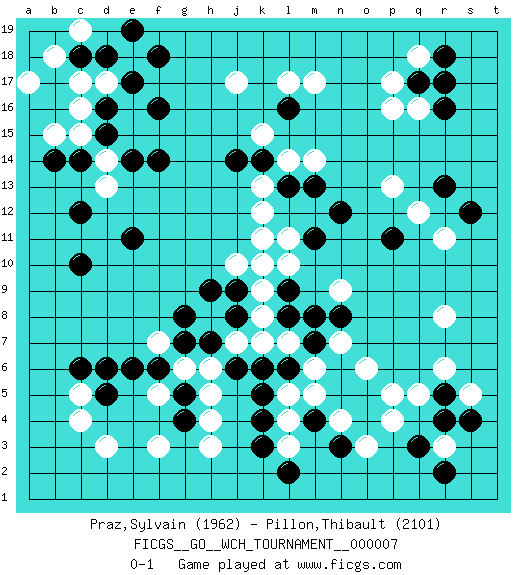 Last move : 0-1 2011 July 18 14:21:58 [Event "FICGS__GO__WCH_TOURNAMENT__000007"] [Site "FICGS"] [Date "2011.04.01"] [Round "1"] [Black "Praz,Sylvain"] [White "Pillon,Thibault"] [Result "0-1"] [Rating 1 "1962"] [Rating 2 "2101"] 1.r16 d17 2.q3 d3 3.d15 c15 4.d16 c16 5.e17 e18 6.d18 c17 7.f18 d14 8.f16 q5 9.o4 r3 10.r2 r8 11.r4 r11 12.d5 c5 13.c6 c4 14.d6 f3 15.c10 p17 16.r13 m17 17.q17 j17 18.e14 d13 19.k3 h3 20.k5 q18 21.r18 q16 22.r17 p16 23.f14 s5 24.r5 r6 25.s4 p13 26.l16 l17 27.e11 g6 28.c12 o6 29.p11 q12 30.c18 b18 31.b14 c19 32.e19 b15 33.c14 a17 34.s12 l4 35.k4 m5 36.n6 m6 37.n5 l3 38.m7 l7 39.l6 n7 40.m8 n4 41.o5 o3 42.n3 p4 43.m4 l5 44.k6 p5 45.n8 n4 46.g5 f5 47.f6 h5 48.g4 h4 49.g7 h6 50.h7 k12 51.j14 k15 52.l13 k13 53.k14 l14 54.m13 m14 55.m11 f7 56.e6 j7 57.j8 l11 58.n12 h8 59.g8 k8 60.j9 k7 61.j6 k9 62.k10 j10 63.h9 l10 64.l9 k11 65.l8 k10 66.l2 n9 67.pass pass 0-1 Here are the names of the openings (joseki) played in the four corners : Corner d16 : d17 d15 Komoku (Somok, Xiao~mu`) 3-4 Point. The komoku (3-4) point is the traditional corner enclosure move.. Ikken Takagakari (Hankan Nop'dakeolch'im, Yi Gaogua`jiao~, 1-Space High Approach). The 5-4 approach move has become more popular in modern times, as modern Go emphasizes speed and influence. Corner q4 : q3 q5 Komoku (Somok, Xiao~mu`) 3-4 Point. The komoku (3-4) point is the traditional corner enclosure move.. Ikken Takagakari (Hankan Nop'dakeolch'im, Yi Gaogua`jiao~, 1-Space High Approach). The 5-4 approach move has become more popular in modern times, as modern Go emphasizes speed and influence. Corner q16 : r16 r11 Komoku (Somok, Xiao~mu`) 3-4 Point. The komoku (3-4) point is the traditional corner enclosure move.. Corner d4 : d3 d5 Komoku (Somok, Xiao~mu`) 3-4 Point. The komoku (3-4) point is the traditional corner enclosure move.. Ikken Takagakari (Hankan Nop'dakeolch'im, Yi Gaogua`jiao~, 1-Space High Approach). The 5-4 approach move has become more popular in modern times, as modern Go emphasizes speed and influence. Player White won this Go (weiqi, baduk) game. Follow this game move after move (download)The carpenter's square becomes ko. (Anonymous) The weakness of an artist is dogma. (Josh Waitzkin)