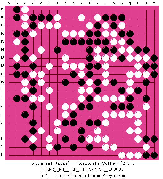 Last move : 0-1 2011 September 9 17:8:11 [Event "FICGS__GO__WCH_TOURNAMENT__000007"] [Site "FICGS"] [Date "2011.04.01"] [Round "1"] [Black "Xu,Daniel"] [White "Koslowski,Volker"] [Result "0-1"] [Rating 1 "2027"] [Rating 2 "2087"] 1.q16 q4 2.d4 d16 3.o3 r6 4.k4 f3 5.h3 g5 6.c6 f7 7.o5 d3 8.c3 e4 9.d5 r11 10.r14 o16 11.o17 p17 12.p16 n17 13.o18 o15 14.p18 l15 15.c14 e14 16.d12 f12 17.k15 k16 18.j15 c10 19.b16 b15 20.c15 b13 21.c16 c17 22.d17 e17 23.d18 j16 24.h15 c18 25.e18 f17 26.f18 g17 27.l14 m14 28.l13 g18 29.b18 m13 30.l12 l10 31.m12 n12 32.m15 n11 33.l16 l17 34.m17 m18 35.m16 k18 36.n18 m4 37.l5 n8 38.o7 n6 39.m5 o6 40.p5 p6 41.q5 n5 42.n4 r5 43.j11 n3 44.o4 m3 45.l2 o2 46.p2 c19 47.b19 n2 48.q3 r3 49.r2 p3 50.p4 r4 51.s3 p1 52.q2 q6 53.p3 s2 54.s1 l3 55.k3 t2 56.t3 q1 57.t1 s2 58.d9 r1 59.d10 j7 60.h5 h6 61.j5 f9 62.s12 c9 63.c8 p14 64.s10 d8 65.d7 e8 66.b8 d11 67.c11 e11 68.b11 q11 69.g2 s11 70.t11 r13 71.s14 s13 72.t13 d13 73.c13 q14 74.q15 r12 75.t12 c12 76.b12 e10 77.r9 f2 78.j2 s7 79.p9 q9 80.q8 q10 81.s8 p8 82.p7 g4 83.d2 h13 84.h10 o8 85.q7 h16 86.g14 h12 87.k7 k8 88.j6 h7 89.l7 n16 90.n14 n13 91.o14 o13 92.l15 k12 93.l11 k11 94.k10 j12 95.m10 l9 96.n15 p15 97.p13 q13 98.m9 m8 99.l8 k9 100.o10 n10 0-1 Here are the names of the openings (joseki) played in the four corners : Corner q4 : q4 o3 Hoshi (Hwajeom, Seongjeom, Xingwei`) 4-4 Point. The star or hoshi (4-4) point, emphasizing influence at the potential expense of territory. Ikken Kakari (Hankan Keolch'im, Yi Gua`jiao~, 1-Space Low Approach). Black 2 is the standard approach move to the 4-4. Corner d4 : d4 f3 Hoshi (Hwajeom, Seongjeom, Xingwei`) 4-4 Point. The star or hoshi (4-4) point, emphasizing influence at the potential expense of territory. Ikken Kakari (Hankan Keolch'im, Yi Gua`jiao~, 1-Space Low Approach). White 2 is the standard approach move to the 4-4. Corner q16 : q16 r11 Hoshi (Hwajeom, Seongjeom, Xingwei`) 4-4 Point. The star or hoshi (4-4) point, emphasizing influence at the potential expense of territory. Corner d16 : d16 c14 Hoshi (Hwajeom, Seongjeom, Xingwei`) 4-4 Point. The star or hoshi (4-4) point, emphasizing influence at the potential expense of territory. Ikken Kakari (Hankan Keolch'im, Yi Gua`jiao~, 1-Space Low Approach). Black 2 is the standard approach move to the 4-4. Player White won this Go (weiqi, baduk) game. Follow this game move after move (download)When your opponent is thick, you must also become thick. (Otake Hideo, 9p) They say in chess you've got to kill the queen, and then you mate it... Oh I, do you ? (Red Hot Chili Peppers, Fortune faded)