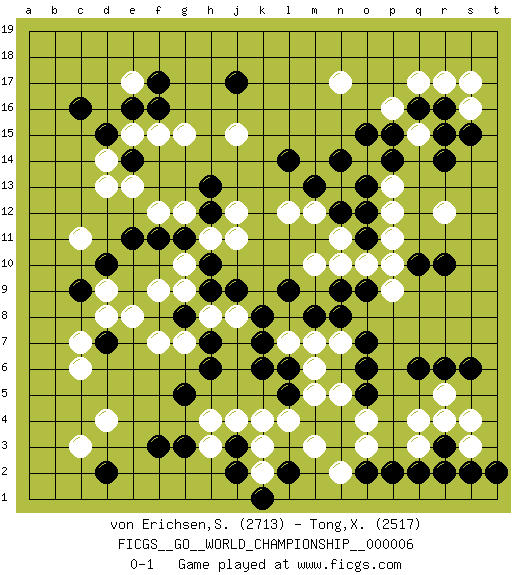 Last move : 0-1 2011 August 30 16:22:5 [Event "FICGS__GO__WORLD_CHAMPIONSHIP__000006"] [Site "FICGS"] [Date "2011.04.01"] [Round "1"] [Black "von Erichsen,Svante Carl"] [White "Tong,Xiao"] [Result "0-1"] [Rating 1 "2713"] [Rating 2 "2517"] 1.r16 d4 2.c16 q4 3.f3 c6 4.d2 c3 5.j3 e17 6.j17 d13 7.d15 e15 8.e14 d14 9.e16 f15 10.f16 g15 11.f17 j15 12.r6 o3 13.q10 r12 14.r10 r5 15.q6 p16 16.p15 r17 17.q16 q17 18.o15 s16 19.s15 s17 20.r14 n17 21.l14 l12 22.d7 d9 23.c9 c7 24.d10 d8 25.e11 f12 26.f11 g12 27.h10 p12 28.n12 q15 29.r15 n13 30.m13 m12 31.o13 n11 32.o12 p11 33.o11 p10 34.o5 p13 35.p14 o10 36.n14 m10 37.n9 n10 38.r3 r4 39.q2 q3 40.s2 s3 41.r2 s4 42.p2 o4 43.o2 n5 44.o6 m3 45.s6 h8 46.l5 m5 47.l6 n2 48.t2 k4 49.h6 k3 50.j2 l4 51.g8 g7 52.h7 g9 53.f8 f9 54.h9 j8 55.k8 f7 56.j9 e8 57.g11 j11 58.g8 h11 59.l2 k2 60.k1 j4 61.g3 h4 62.g5 n7 63.m8 m7 64.l9 g10 65.o9 l7 66.k7 p9 67.o7 m6 68.h12 j12 69.h13 e13 70.n8 c11 71.k6 h3 0-1 Here are the names of the openings (joseki) played in the four corners : Corner d4 : d4 f3 Hoshi (Hwajeom, Seongjeom, Xingwei`) 4-4 Point. The star or hoshi (4-4) point, emphasizing influence at the potential expense of territory. Ikken Kakari (Hankan Keolch'im, Yi Gua`jiao~, 1-Space Low Approach). Black 2 is the standard approach move to the 4-4. Corner d16 : c16 e17 Komoku (Somok, Xiao~mu`) 3-4 Point. The komoku (3-4) point is the traditional corner enclosure move.. Ikken Kakari (Hankan Keolch'im, Yi Gua`jiao~, 1-Space Low Pincer). The small knight move is the basic approach move to the 3-4 point stone. It has been continually used for over four centuries. There are limitless variations, with new moves constantly being discovered. White 2 opens the door to a treaure store of joseki. Corner q4 : q4 r6 Hoshi (Hwajeom, Seongjeom, Xingwei`) 4-4 Point. The star or hoshi (4-4) point, emphasizing influence at the potential expense of territory. Ikken Kakari (Hankan Keolch'im, Yi Gua`jiao~, 1-Space Low Approach). Black 2 is the standard approach move to the 4-4. Corner q16 : r16 r12 Komoku (Somok, Xiao~mu`) 3-4 Point. The komoku (3-4) point is the traditional corner enclosure move.. Player White won this Go (weiqi, baduk) game. Follow this game move after move (download)The weak player fears ko, the strong player seeks it. (Bill Taylor) Hello Thibault, if I have had a plan (and I had one, I hope), I have forgotten it during the last week... - Hello Heinz-Georg. What do you mean a plan ? (Anonymous players, during a Big Chess game)