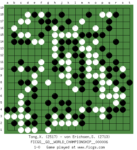 Last move : 1-0 2011 October 4 22:44:26 [Event "FICGS__GO__WORLD_CHAMPIONSHIP__000006"] [Site "FICGS"] [Date "2011.04.01"] [Round "2"] [Black "Tong,Xiao"] [White "von Erichsen,Svante Carl"] [Result "1-0"] [Rating 1 "2517"] [Rating 2 "2713"] 1.q16 d17 2.q3 d3 3.d5 c5 4.d4 c4 5.e3 c6 6.k4 r6 7.r4 r9 8.r11 p6 9.q7 q6 10.n4 p9 11.r14 d15 12.k17 p18 13.q17 q18 14.r18 m17 15.g17 o16 16.m15 l16 17.k14 l15 18.l14 m14 19.n15 m13 20.o15 j15 21.l12 o12 22.m12 o14 23.p15 j17 24.j18 q11 25.j16 h16 26.h17 k15 27.f15 h13 28.h11 j11 29.j12 h12 30.j10 k11 31.l13 n12 32.m10 k10 33.m8 k12 34.j14 h14 35.j13 j9 36.h10 k8 37.p13 n13 38.o8 g8 39.d14 c15 40.q10 p10 41.p11 o11 42.l9 k9 43.q9 q8 44.q12 p8 45.o7 p7 46.c11 f14 47.c14 e14 48.c8 f18 49.g16 h15 50.g18 m4 51.n5 j4 52.k5 k3 53.g3 h3 54.c3 b3 55.d2 c2 56.e7 d7 57.d8 e8 58.e6 e9 59.b2 c1 60.b4 d3 61.j5 h5 62.c3 c10 63.b10 d3 64.h6 h2 65.c3 a3 66.a4 d3 67.g5 c3 68.h4 l2 69.j3 j2 70.l3 k2 71.m2 e1 72.d10 f11 73.m11 o9 74.s5 l7 75.m7 s6 76.s9 s10 77.r10 s8 78.r8 r7 79.t8 r9 80.e10 f10 81.r8 r5 82.s4 r9 83.g2 g1 84.r8 n9 85.m9 r9 86.e2 d1 87.r8 n10 88.s7 p4 89.b15 b16 90.b14 c17 91.e18 d18 92.f17 p3 93.q4 o4 94.m3 n11 95.n18 1-0 Thibault de Vassal Tough game... still kind of weird for my weak understanding :) Here are the names of the openings (joseki) played in the four corners : Corner d4 : d3 d5 Komoku (Somok, Xiao~mu`) 3-4 Point. The komoku (3-4) point is the traditional corner enclosure move.. Ikken Takagakari (Hankan Nop'dakeolch'im, Yi Gaogua`jiao~, 1-Space High Approach). The 5-4 approach move has become more popular in modern times, as modern Go emphasizes speed and influence. Corner q4 : q3 r6 Komoku (Somok, Xiao~mu`) 3-4 Point. The komoku (3-4) point is the traditional corner enclosure move.. Niken Kakari (Dukan Keolch'im, E`r Gua`jiao~, 2-Space Low Approach). White 2 is used with friendly forces backing it up. Its purpose is to prevent a pincer. Locally it results in a loss, but may be appropriate fuseki strategy. It was popular in the late 1950s and early 1960s, but is not seen often nowadays, having been replaced by the one-space high approach, with which it has points in common. Player Black won this Go (weiqi, baduk) game. Follow this game move after move (download)When your opponent has two weak groups, attack them both at once. (Anonymous) 98% of all statistics are made up. (Author unknown)