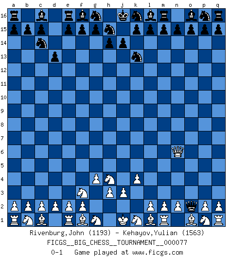 Last move : 0-1 2011 May 19 6:19:6 [Event "FICGS__BIG_CHESS__TOURNAMENT__000077"] [Site "FICGS"] [Date "2011.04.01"] [Round "1"] [White "Rivenburg,John"] [Black "Kehayov,Yulian"] [Result "0-1"] [WhiteElo "1193"] [BlackElo "1563"] 1.g2-g4 b16-c14 2.k2-k4 j15-k13 3.j2-h4 h16-o10 4.h2-f3 o10-o2 5.h1-n6 d15-d13 0-1 This big chess game has been lost on time (started : 2011.04.01 11:51:30) Follow this game move after move (download)Who is your opponent tonight, tonight I am playing against the Black pieces. (Akiba Rubinstein) Zum Sieg gelangt man nicht, wenn man gut, sondern nur wenn man besser spielt (Savielly Grigorievitsch Tartakower) Las Aperturas te enseñan aperturas. ¡Los Finales te enseñan Ajedrez!. (Stephan Gerzadowicz) Je menace de comprendre la position. (Anonyme) Perhaps chess is the wrong game for the times (The Chess Master and the Computer, by Garry Kasparov - 2010)