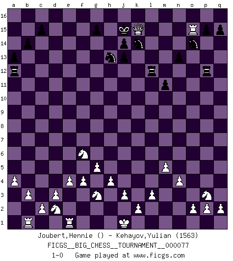 Last move : 1-0 2011 May 26 0:5:32 [Event "FICGS__BIG_CHESS__TOURNAMENT__000077"] [Site "FICGS"] [Date "2011.04.01"] [Round "1"] [White "Joubert,Hennie"] [Black "Kehayov,Yulian"] [Result "1-0"] [WhiteElo ""] [BlackElo "1563"] 1.g2-g4 j15-h13 2.h3-h4 b16-c14 3.g4-g5 e15-e13 4.h1-d5 m15-m13 5.f1-m7 d15-d13 6.m7-c16 a16-c16 7.d5-d13 c16-d16 8.d13-f15 e16-e15 9.f15-f13 d16-d15 10.g1-f3 e15-f15 11.f13-b9 f16-b12 12.n2-n4 n15-n13 13.o1-c12 f15-e15 14.b2-b3 a15-a14 15.c1-b2 k16-l14 16.p1-n2 o16-k12 17.d2-d3 p16-o14 18.m2-m4 c14-a13 19.b9-b12 a13-c12 20.b12-c12 b15-b14 21.l1-p5 e15-f15 22.b1-d2 a14-a13 23.e2-e4 h16-m12 24.b2-m12 l14-m12 25.m1-m3 l16-o13 26.m3-l3 m12-k13 27.m4-m5 f15-f12 28.c12-c11 j16-j15 29.c11-e13 g16-f14 30.p5-f14 m16-e16 31.e13-a9 h13-f14 32.h2-g4 k12-l11 33.a1-b1 o13-p12 34.a9-a10 l11-c3 35.k1-h2 c3-d2 36.f3-d2 p12-g4 37.h2-g4 f14-h13 38.q1-m1 q16-m16 39.g4-f6 k13-j11 40.f2-f4 e16-e12 41.l3-l15 m16-m15 42.l15-m15 e12-a12 43.a10-k10 f12-k12 44.k10-j10 d15-d13 45.m15-o15 d13-d12 46.a2-a4 k12-p12 47.n2-p3 d12-j12 48.j10-o10 h13-k14 49.m1-m4 j11-h13 50.j2-g3 j12-o12 51.o10-l13 o12-l12 52.l13-n15 h15-j13 53.l2-l3 m13-m12 54.m4-j4 m12-m11 55.j4-j13 h14-j13 56.n15-k15 1-0 Follow this game move after move (download)Chess holds its master in its own bonds, shackling the mind and brain so that the inner freedom of the very strongest must suffer. (Albert Einstein) Der vorletzte Fehler gewinnt. (Savielly Grigorievitsch Tartakower) Yo creo que el Ajedrez posee una magia que es también una ayuda en la edad avanzada. Una rodilla reumática es olvidada durante una partida de Ajedrez y otros eventos pueden parecer algo sin importancia comparada a una catástrofe en el tablero de Ajedrez. (Vlastimil Hort) A ce moment-là, je menaçais de comprendre la position ! (Clément L'Heureux) Who needs drugs and alcohol if he can play Big Chess at FICGS ? (Heinz-Georg Lehnhoff)