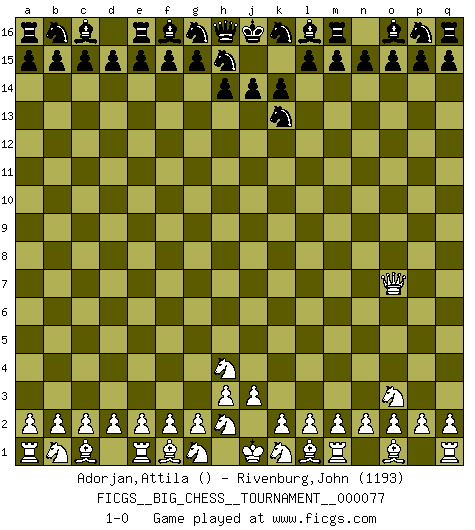 Last move : 1-0 2011 May 25 6:45:56 [Event "FICGS__BIG_CHESS__TOURNAMENT__000077"] [Site "FICGS"] [Date "2011.04.01"] [Round "1"] [White "Adorjan,Attila"] [Black "Rivenburg,John"] [Result "1-0"] [WhiteElo ""] [BlackElo "1193"] 1.j2-h4 j15-k13 2.p1-o3 k15-k14 3.h1-o7 1-0 This big chess game has been lost on time (started : 2011.04.01 11:51:30) Follow this game move after move (download)The stomach is an essential part of the Chess master. (Bent Larsen) Ein Schachgenie ist jemand der verdammt gut Schach spielt. (Jonathan Levitt) En el Ajedrez, tal como es jugado por los Maestros, practicamente la suerte es eliminada. (Emanuel Lasker) Les écrivains ont utilisé les échecs pour analyser les côtés extrêmes de la nature humaine. Dans ce cadre, les échecs offrent un champ d'expérimentation idéal. Mais on pourrait faire la même chose avec la peinture. Et là, en vous référant à Van Gogh, vous ne tirerez pas de conclusion définitive sur les peintres. (Gary Kasparov) The smarter you play, the luckier you'll be. (Mark Pilarski)