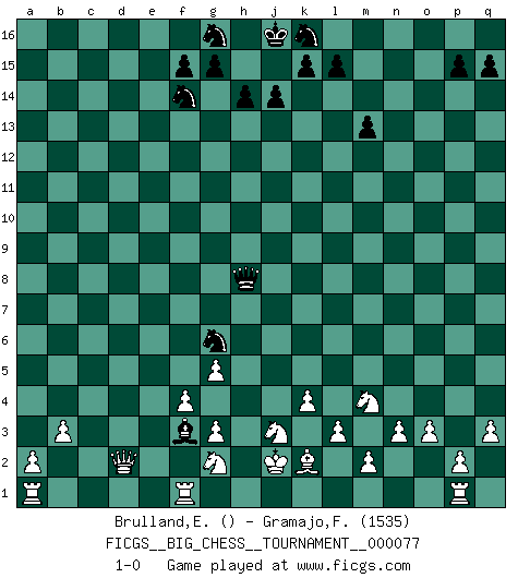 Last move : 1-0 2011 May 24 6:52:16 [Event "FICGS__BIG_CHESS__TOURNAMENT__000077"] [Site "FICGS"] [Date "2011.04.01"] [Round "1"] [White "Brulland,Emmanuel"] [Black "Gramajo,Francisco"] [Result "1-0"] [WhiteElo ""] [BlackElo "1535"] 1.e2-e3 b16-c14 2.j2-h4 d15-d13 3.h1-o7 j15-h13 4.o7-o15 e15-e13 5.n2-n3 p16-o14 6.o15-h9 m15-m13 7.h9-d13 c16-e14 8.d13-b13 n15-n13 9.b13-b15 c14-d12 10.b15-c15 a16-c16 11.c15-e13 d12-f11 12.e13-n5 c16-c2 13.n5-n13 o16-m14 14.n13-f6 f11-g9 15.f6-g6 f16-d14 16.g6-c2 e16-c16 17.c2-g6 q16-n16 18.p1-o3 n16-n6 19.g6-d9 n6-c6 20.b1-c3 o14-n12 21.d9-d14 n12-l11 22.d14-a14 l11-j10 23.g2-g3 h13-g11 24.f1-g2 c6-l6 25.o3-m4 l6-f6 26.f2-f4 l16-p12 27.k2-k4 g9-j8 28.h2-g4 p12-g4 29.h3-g4 h16-o10 30.o2-o3 m14-e7 31.c3-d5 f6-f7 32.o1-g8 f7-p7 33.g8-j10 g11-j10 34.q1-p1 j8-h6 35.g4-g5 h6-g4 36.d5-e7 p7-e7 37.g2-f3 g4-j3 38.k1-j3 o10-q8 39.q2-q3 m16-m14 40.l1-k2 m14-l14 41.l2-l3 j10-h8 42.g1-h3 q8-n8 43.j1-h2 l14-l13 44.b2-b3 l13-c13 45.c1-b2 c13-c2 46.b2-c3 c16-c3 47.a14-a15 c2-d2 48.h4-g2 h8-g6 49.a15-a16 h15-f14 50.a16-a5 e7-e3 51.e1-e3 c3-e3 52.a5-d2 e3-f3 53.h3-g1 e14-l8 54.g1-f3 l8-f3 55.m1-f1 n8-h8 56.h2-j2 1-0 Follow this game move after move (download)Chess is above all, a fight ! (Emanuel Lasker) Ich verlor meine Bürgerrechte, mein Gehalt wurde mir nicht mehr bezahlt und ich wurde zensiert und durfte nicht mehr ins Ausland reisen. [nach dem Match Fischer-Taimanov 6:0] (Mark Taimanov) No solamente yo pronostico su triunfo sobre Botvinnik, sino que me adelanto y digo que probablemente Fischer es el jugador de Ajedrez mas grande que haya existido. (John Collins) Ne tendez aucun piège pour le plaisir ! Ne jouez rien dans l'espoir que l'adversaire réagisse de façon stupide ! Prenez toujours pour acquis que l'adversaire va trouver le meilleur coup ! Ne jouez jamais de coup dans l'espoir que l'adversaire ne voie pas la menace ! Chacun de vos coups doit améliorer la position d'une façon ou d'une autre. There are three kinds of lies: lies, damned lies and statistics. (Mark Twain)