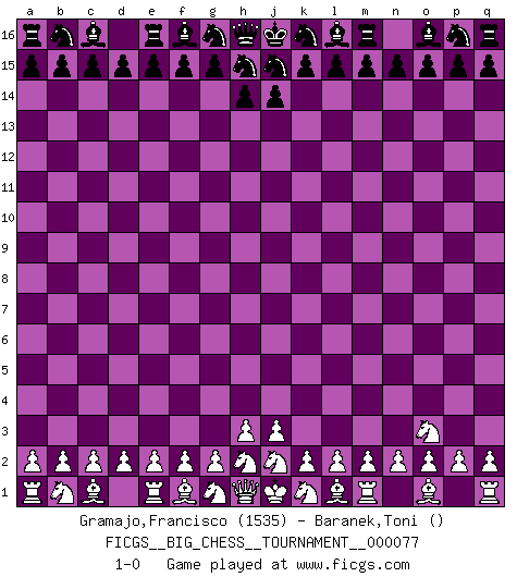 Last move : 1-0 2011 May 3 17:26:18 [Event "FICGS__BIG_CHESS__TOURNAMENT__000077"] [Site "FICGS"] [Date "2011.04.01"] [Round "1"] [White "Gramajo,Francisco"] [Black "Baranek,Toni"] [Result "1-0"] [WhiteElo "1535"] [BlackElo ""] 1.p1-o3 1-0 This big chess game has been lost on time (started : 2011.04.01 11:51:30) Follow this game move after move (download)Chess books should be used as we use glasses: to assist the sight, although some players make use of them as if they thought they conferred sight. (Jose Raul Capablanca) Schach ist wie eine schöne Frau, zu der wir ständig zurückkehren, gleichviel, wie oft sie uns zurückweist. (Anonymous) Tu no necesitas jugar muy bien, únicamente ayudar a tu oponenet a que juegue muy mal. (Genrikh Chepukaitis) Vouloir jouer aux échecs contre soi-même est aussi paradoxal que vouloir marcher sur son ombre. (Stefan Zweig) Begin at the beginning and go on till you come to the end; then stop. (Lewis Carrol, Alice in Wonderland)