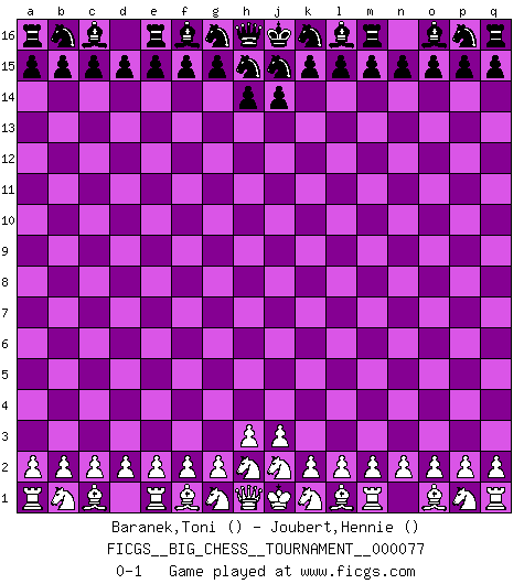 Last move : 0-1 2011 May 3 5:22:54 [Event "FICGS__BIG_CHESS__TOURNAMENT__000077"] [Site "FICGS"] [Date "2011.04.01"] [Round "1"] [White "Baranek,Toni"] [Black "Joubert,Hennie"] [Result "0-1"] [WhiteElo ""] [BlackElo ""] 0-1 This big chess game has been lost on time (started : 2011.04.01 11:51:30) Follow this game move after move (download)One bad move nullifies forty good ones. (Horowitz) Nicht daß Diemer aus Opportunismus Mitglied der NSDAP geworden wäre. Er war ein Fanatiker, in allem, was er tat. (Hans Ree) En la vida, como en el Ajedrez, los Peones propios obstruyen nuestro camino. La gran fortuna de un hombre, su comodidad, placer, hijos, libros, que deberían ayudarle a ganar, con mucha frecuencia lo ponen en Jaque Mate. (Charles Buxton) Les échecs, c'est l'art d'analyser. (Mikhail Botvinnik) Live, lose, and learn, by observing your opponent how to win. (Amber Steenbock)