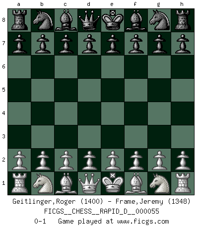 Last move : 0-1 2011 May 3 5:22:54 [Event "FICGS__CHESS__RAPID_D__000055"] [Site "FICGS"] [Date "2011.04.01"] [Round "1"] [White "Geitlinger,Roger"] [Black "Frame,Jeremy"] [Result "0-1"] [WhiteElo "1400"] [BlackElo "1348"] 0-1 This chess game has been lost on time (started : 2011.04.01 11:54:16) Player Black won this chess game. Follow this game move after move (download)Chess opens and enriches your mind. (Saudin Robovic) Fischer: 'Remis!?' Uhlmann: 'Aber es muss doch dreimal Zugwiederholung sein!' Fischer: 'Sie nehmen das Remis an, wie ich es sage, sonst spiele ich weiter und werde Sie dann schlagen!' (Robert James Fischer) Uno por uno, yo los acribillé, mi superioridad muy pronto se volvio aparente. (Jose Capablanca) Il n'y a plus de joueurs du niveau de Jacob Murray dont la seule quête est le beau jeu, le plaisir de voir les pièces construire quelque chose. Sur 10 idées à la minute, 9 seront sans intérêt, la dernière s'avèrera géniale. (Christian Bauer) Any activity becomes creative when the doer cares about doing it right or doing it better. (John Updike)