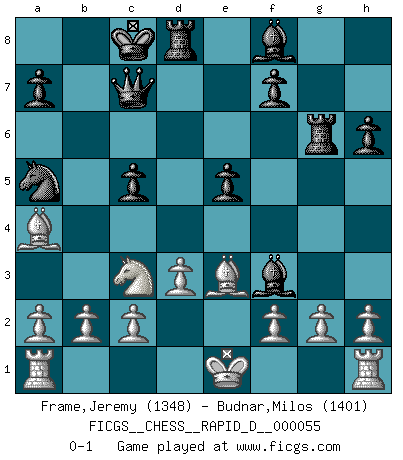 Last move : 0-1 2011 May 10 12:30:18 [Event "FICGS__CHESS__RAPID_D__000055"] [Site "FICGS"] [Date "2011.04.01"] [Round "1"] [White "Frame,Jeremy"] [Black "Budnar,Milos"] [Result "0-1"] [WhiteElo "1348"] [BlackElo "1401"] 1.e4 e5 2.Nf3 Nc6 3.Bc4 Nf6 4.Ng5 d5 5.exd5 Na5 6.Bb5+ c6 7.dxc6 bxc6 8.Ba4 Bb7 9.Qf3 Qc7 10.d3 h6 11.Ne4 O-O-O 12.Nxf6 gxf6 13.Qxf6 Rg8 14.Be3 Rg6 15.Qf3 c5 16.Nc3 Bxf3 0-1 Two knights defense Queenside Castling by player Black (move 11) Player Black won this chess game. Follow this game move after move (download)First-class players lose to second class players because second-class players sometimes play a first-class game. (Tarrasch) Es ist nicht das erste mal, dass sich die FIDE dem Arabischen Geld gebeugt hat (über die FIDE WM 2004 in Lybien). (Larry Evans) No es tiempo de jugar al Ajedrez cuando la casa esta en llamas. (Proverbio Italiano) RxDa4 pat (...) The only thing that matters is the evidence. (Horatio Caine, C.S.I. Miami)