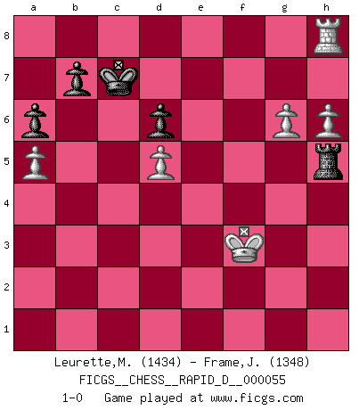 Last move : 1-0 2011 April 28 22:44:23 [Event "FICGS__CHESS__RAPID_D__000055"] [Site "FICGS"] [Date "2011.04.01"] [Round "1"] [White "Leurette,Marc-Antoine"] [Black "Frame,Jeremy"] [Result "1-0"] [WhiteElo "1434"] [BlackElo "1348"] 1.e4 e5 2.Nf3 Nf6 3.Nc3 Nc6 4.d4 d6 5.d5 Ne7 6.Bb5+ Bd7 7.Bxd7+ Qxd7 8.O-O c6 9.dxc6 Qxc6 10.Bg5 Nd7 11.Nd5 Nxd5 12.exd5 Qc5 13.b3 Nb6 14.c4 Be7 15.Bxe7 Kxe7 16.Ng5 f6 17.Ne6 Qb4 18.Qe1 Qxe1 19.Rfxe1 Rac8 20.Nxg7 Rcg8 21.Ne6 Nd7 22.f4 f5 23.fxe5 Nxe5 24.Rf1 Rg6 25.Rxf5 Rhg8 26.g3 a6 27.a4 Nd3 28.Rd1 Rxe6 29.Rxd3 Re2 30.R5f3 Kd8 31.Rf7 Rb2 32.Rxh7 Re8 33.Rf3 Re1+ 34.Rf1 Rxf1+ 35.Kxf1 Rxb3 36.a5 Rb4 37.h4 Kc8 38.h5 Rxc4 39.h6 Rc1+ 40.Kg2 Rc2+ 41.Kf3 Rh2 42.g4 Rh1 43.Rh8+ Kc7 44.g5 Rh5 45.g6 1-0 Petrov Three knights game Kingside Castling by player White (move 8) Player White won this chess game. Follow this game move after move (download)A Chess game is divided into three stages: the first, when you hope you have the advantage, the second when you believe you have an advantage, and the third... when you know you're going to lose ! (Savielly Tartakower) Konzentriere dich auf materielle Gewinne. Nimm, was dir dein Gegner gibt, ausser es gibt einen guten Grund der dagegenspricht. (Robert James Fischer) Yo adoro todas la posiciones. Denme una partida posicional difícil, y la jugaré. Pero posiciones totalmente ganadas, no las tolero. (Hein Donner) La guerre est enfant de la passion, la passion est enfant du narcissisme et le narcissisme est l'enfant. (...) Une autre partie ? (Thibault de Vassal) There is no vagueness without wind. (Chinese proverb)