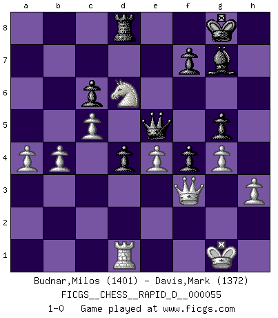 Last move : 1-0 2011 August 27 22:1:45 [Event "FICGS__CHESS__RAPID_D__000055"] [Site "FICGS"] [Date "2011.04.01"] [Round "1"] [White "Budnar,Milos"] [Black "Davis,Mark"] [Result "1-0"] [WhiteElo "1401"] [BlackElo "1372"] 1.e4 c5 2.Nf3 Nc6 3.d4 cxd4 4.Nxd4 g6 5.Nxc6 bxc6 6.Bd3 Bg7 7.O-O e5 8.h3 Nf6 9.b4 O-O 10.Bb2 d6 11.Na3 Bb7 12.c4 Rb8 13.Qa4 Re8 14.Qxa7 Re7 15.Qe3 Qf8 16.Qf3 Nh5 17.Bc1 Rbe8 18.g4 Nf6 19.Bg5 Re6 20.c5 d5 21.Bxf6 Rxf6 22.Qg2 d4 23.Nc4 Ba6 24.Qg3 h5 25.Nd6 Bxd3 26.Qxd3 Rd8 27.Qg3 Rf4 28.f3 hxg4 29.fxg4 Qe7 30.Rxf4 exf4 31.Qf3 Qe5 32.Rd1 g5 33.a4 1-0 This chess game has been lost on time (started : 2011.04.01 11:54:16) Sicilian : Accelerated Fianchetto, Exchange variation Kingside Castling by player White (move 7) Kingside Castling by player Black (move 9) Player White won this chess game. Follow this game move after move (download)Personally, I rather look forward to a computer program winning the world Chess Championship. Humanity needs a lesson in humility. (Richard Dawkings) Der Partner hat auch seine Existenzberechtigung. (Savielly Grigorievitsch Tartakower) El Ajedrez es un mar en el cual un mosquito puede beber y un elefante puede bañarse. (Refrán Hindú) Celui qui prend des risques peut perdre, celui qui n'en prend pas perd toujours. (Xavier Tartacover) Beta. Software undergoes beta testing shortly before it's released. Beta is latin for still doesn't work. (Anonymous)