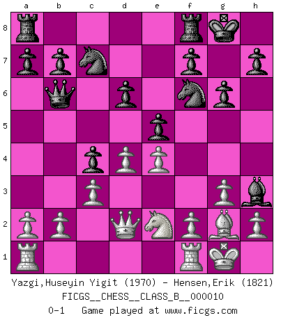 Last move : 0-1 2007 May 17 21:43:51 [Event "FICGS__CHESS__CLASS_B__000010"] [Site "FICGS"] [Date "2006.12.16"] [Round "1"] [White "Yazgi,Huseyin Yigit"] [Black "Hensen,Erik"] [Result "0-1"] [WhiteElo "1970"] [BlackElo "1821"] 1.e4 c5 2.Nc3 Nc6 3.g3 g6 4.Bg2 Bg7 5.d3 d6 6.Be3 Nd4 7.Nce2 e5 8.c3 Ne6 9.Qd2 Nf6 10.Bh6 Bxh6 11.Qxh6 c4 12.d4 Qb6 13.Qd2 O-O 14.Nh3 Nc7 15.O-O Bxh3 0-1 This chess game has been lost on time (started : 2006.12.16 22:7:14) Sicilian : Closed, 6.Be3 Kingside Castling by player Black (move 13) Kingside Castling by player White (move 15) Player Black won this chess game. Follow this game move after move (download)Chess is not like life... it has rules ! (Mark Pasternak) Capablanka war das größte Genie der Schachgeschichte! Aber denken sie nicht er habe nichts vom Schach verstanden. Er wusste nur soviel wie er wissen musste um seine Ziele zu erreichen. (Mikhail Moiseyevich Botvinik) Cuando me preguntan: -¿Cual es el secreto que te hace hacer mejores movidas que tus oponentes?, Yo respondo: Me da gusto que me pregunten eso, porque, como veran, hay una simple razón. Yo pienso mis propias movidas y dejo a mi oponente que el piense las suyas. (Alexander Alekhine) Des idées, des idées, j'en ai cent, j'en ai mille. Des bonnes, des mauvaises, applicables, irréalisables... Il suffit de faire le tri ! (Roos) For to win one hundred victories in one hundred battles is not the acme of skill. To subdue the enemy without fighting is the acme of skill. (Sun Tzu)