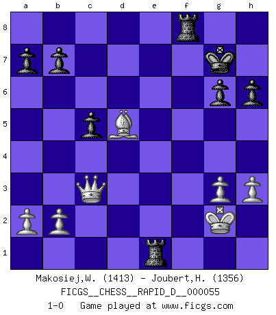 Last move : 1-0 2011 June 30 8:59:30 [Event "FICGS__CHESS__RAPID_D__000055"] [Site "FICGS"] [Date "2011.04.01"] [Round "1"] [White "Makosiej,Wladyslaw"] [Black "Joubert,Hennie"] [Result "1-0"] [WhiteElo "1413"] [BlackElo "1356"] 1.c4 Nf6 2.g3 g6 3.Bg2 Bg7 4.Nc3 O-O 5.e4 d6 6.Nge2 Nbd7 7.O-O e5 8.d3 Nb6 9.f4 Bg4 10.h3 Bxe2 11.Nxe2 Qd7 12.f5 Rad8 13.Bg5 h6 14.Be3 Qe7 15.Qd2 Kh7 16.d4 Nxc4 17.fxg6+ fxg6 18.Qc1 Nxe3 19.Qxe3 exd4 20.Nxd4 Rfe8 21.Rae1 Nd7 22.Rf4 Ne5 23.Ref1 c6 24.Nf3 Nxf3+ 25.R1xf3 c5 26.Rf7 Qxe4 27.Rxg7+ Kxg7 28.Rf7+ Kxf7 29.Bxe4 d5 30.Qf3+ Kg7 31.Bxd5 Re1+ 32.Kg2 Rf8 33.Qc3+ 1-0 English, 1...Nf6 (Anglo-Indian defense) Kingside Castling by player Black (move 4) Kingside Castling by player White (move 7) Player White won this chess game. Follow this game move after move (download)The sign of a great Master is his ability to win a won game quickly and painlessly. (Irving Chernev) Im Wettkampf zwischen starken Meistern kommen Fehler sehr selten vor, deshalb ist es mit bloßem Warten nicht getan. (José Raúl Capablanca) Un sacrificio se refuta mucho mejor al aceptarlo. (Wilhelm Steinitz) À la honte des hommes, on sait que les lois du jeu sont les seules qui soient partout justes, claires, inviolables et exécutées. Pourquoi l'Indien qui a donné les règles du jeu d'échecs est-il obéi de bon gré dans toute la terre, et que les décrétales des papes, par exemple, sont aujourd'hui un objet d'horreur et de mépris ? C'est que l'inventeur des échecs combina tout avec justesse pour la satisfaction des joueurs, et que les papes, dans leurs décrétales, n'eurent en vue que leur seul avantage. L'Indien voulut exercer également l'esprit des hommes et leur donner du plaisir; les papes ont voulu abrutir l'esprit des hommes. Voltaire (Dictionnaire philosophique / Garnier 1967) Warrior pose battles inner weakness and wins focus. You see that there is no war within you. You're on your own side, and you are your own strength. (Terri Guillemets)