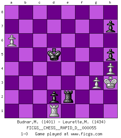 Last move : 1-0 2011 July 12 12:51:5 [Event "FICGS__CHESS__RAPID_D__000055"] [Site "FICGS"] [Date "2011.04.01"] [Round "1"] [White "Budnar,Milos"] [Black "Leurette,Marc-Antoine"] [Result "1-0"] [WhiteElo "1401"] [BlackElo "1434"] 1.e4 e5 2.Nf3 Nc6 3.Bb5 Bc5 4.c3 Nf6 5.d4 exd4 6.e5 Ng4 7.cxd4 Bb4+ 8.Bd2 O-O 9.O-O a6 10.Bc4 d5 11.Be2 f6 12.h3 Nh6 13.Bxh6 gxh6 14.a3 Be7 15.Nc3 Be6 16.b4 fxe5 17.dxe5 Kh8 18.Nd4 Nxd4 19.Qxd4 Bg5 20.Rad1 c6 21.Bg4 Qd7 22.Bxe6 Qxe6 23.f4 Bh4 24.Ne2 Rg8 25.f5 Qe7 26.f6 Qe6 27.Qxh4 Qxe5 28.Qf2 Raf8 29.g3 h5 30.h4 Rg6 31.f7 Rg7 32.Nf4 Rgxf7 33.Qd4 Qxd4+ 34.Rxd4 Kg8 35.Re1 Rf5 36.Re7 R8f7 37.Re3 Kg7 38.Kg2 b6 39.Kh3 R7f6 40.Re6 Rxe6 41.Nxe6+ Kf6 42.Nd8 c5 43.bxc5 bxc5 44.Ra4 a5 45.Rxa5 d4 46.Ra6+ Ke5 47.Nc6+ Ke4 48.Nxd4 cxd4 49.Re6+ Kd5 50.Re1 d3 51.a4 d2 52.Rd1 Rf2 53.a5 Re2 54.a6 1-0 Ruy Lopez : Classical defense, 4.c3 Kingside Castling by player Black (move 8) Kingside Castling by player White (move 9) 10 pieces endgame at move 48 : White KRPPP , Black KRPPP WHITE : King + 1 Rook 3 Pawns BLACK : King + 1 Rook 3 Pawns Player White won this chess game. Follow this game move after move (download)Even the laziest King flees wildly in the face of a double check ! (Aaron Nimzowitsch) Im Hotelzimmer gab es nur zwei Schaben. (Über die Turnierbedingungen) (Peter Swidler) Una buena memoria, concentración, imaginación y una fuerte voluntad, se requiere para llegar a ser un buen jugador. (Bobby Fischer) Les Echecs, c'est l'art de la guerre sans les charniers, c'est la résurrection des morts tombés au champ d'honneur, l'espoir perpétuel, la suprématie de l'intelligence sur la force, la culture de l'esprit. (F. Szpiner) Bobby never cared about money, though. His only desire was to prove that his choices were correct: He wanted chess to be important because he was a chess player, and he wanted to be important. Bobby knew money was important, but he didn't have a clue why, outside of clothes and status. The only way he could accomplish what he wanted was to fight for a lot of money. Once he got it, he gave it away. He did not know how to spend it. And once he'd become champion, after, essentially, sacrificing his life for it, he didn't know how to spend his time. (Bob Wade)
