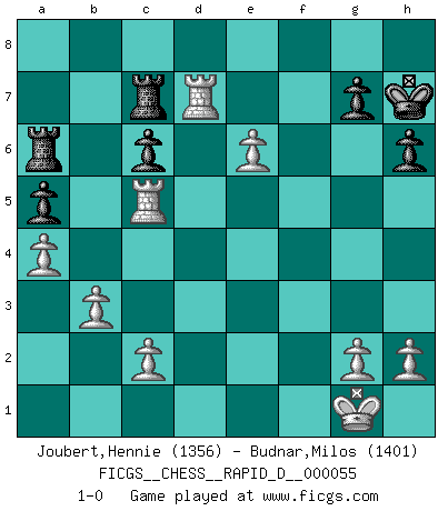 Last move : 1-0 2011 June 11 17:11:2 [Event "FICGS__CHESS__RAPID_D__000055"] [Site "FICGS"] [Date "2011.04.01"] [Round "1"] [White "Joubert,Hennie"] [Black "Budnar,Milos"] [Result "1-0"] [WhiteElo "1356"] [BlackElo "1401"] 1.e4 e5 2.Nf3 Nc6 3.Bc4 Nf6 4.d4 exd4 5.e5 d5 6.Bb5 Ne4 7.Nxd4 Bd7 8.Bxc6 Bxc6 9.Nxc6 bxc6 10.O-O Be7 11.Be3 Ng5 12.f4 Ne4 13.Nd2 Nxd2 14.Qxd2 O-O 15.Rad1 h6 16.Qc3 c5 17.Bxc5 Bxc5 18.Qxc5 Qb8 19.b3 Qb6 20.Rxd5 Qxc5 21.Rxc5 Rfc8 22.Rd1 a5 23.a4 c6 24.Rd6 Ra6 25.f5 Rc7 26.e6 fxe6 27.fxe6 Kh7 28.Rd7 1-0 Two knights defense Kingside Castling by player White (move 10) Kingside Castling by player Black (move 14) Player White won this chess game. Follow this game move after move (download)As one by one I mowed them down, my superiority soon became apparent. (Jose Capablanca) Bis jetzt ist Weiß einer wohlbekannten Analyse gefolgt. Aber jetzt begeht er einen schrecklichen Fehler: Er beginnt seinen eigenen Kopf zu benutzen. (Siegbert Tarrasch) Al jugar al Ajedrez entonces, podemos aprender: Primero: Previsión... Segundo: Prudencia... Tercero: Cautela... Y al final, aprendemos del Ajedrez el hábito de no ser desanimados por apariencias malas presentes en el estado de nuestros asuntos, el hábito de la esperanza por una oportunidad favorable y la perseveración de los secretos de los recursos. (Benjamin Franklin) Vous savez, camarade Pachman, je n'éprouve pas de plaisir à être ministre, je jouerais plutôt aux échecs comme vous, ou alors ferais une révolution au Venezuela. (Che Guevara à Ludek Pachman, 'Checkmate in Prague', 1975) When I took office, only high energy physicists had ever heard of what is called the World Wide Web... Now even my cat has its own page. (Bill Clinton, 1996)