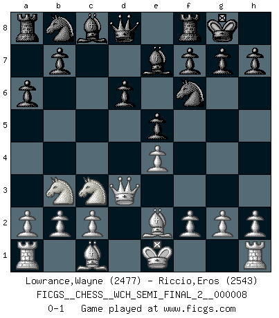 Last move : 0-1 2011 May 28 3:46:0 [Event "FICGS__CHESS__WCH_SEMI_FINAL_2__000008"] [Site "FICGS"] [Date "2011.04.01"] [Round "6"] [White "Lowrance,Wayne"] [Black "Riccio,Eros"] [Result "0-1"] [WhiteElo "2477"] [BlackElo "2543"] 1.e4 c5 2.Nf3 d6 3.d4 cxd4 4.Nxd4 Nf6 5.Nc3 a6 6.Be2 e5 7.Nb3 Be7 8.Qd3 O-O 0-1 Sicilian : Najdorf, Opovcensky variation Kingside Castling by player Black (move 8) Player Black won this chess game. Follow this game move after move (download)In Fischer's hands, a slight theoretical advantage is as good a being a Queen ahead. (Isaac Kashdan) Ich kenne keine einzige Person, die behaupten würde, Garri Kasparow sei ein guter Mensch (Nigel Short) Hay jugadores fuertes y personas amables y yo soy un jugador fuerte. (Bobby Fischer) Dans le domaine de la peinture, de la gravure et de la sculpture, dès la première décennie de notre siècle, les artistes abandonnent la représentation de la partie d'échecs pour se concentrer sur les pièces, sur les échiquiers et sur toutes les variations auxquelles les unes et les autres peuvent donner lieu. On passe en quelque sorte d'un thème social à un thème musical (au sens de la musica médiévale, c'est-à-dire d'une notion qui inclue le rythme, l'harmonie, la construction et la déconstruction, etc.). Graphiquement et picturalement, l'échiquier apparaît comme une structure ouverte, dynamique, d'une richesse infinie, autorisant toutes les combinatoires et débouchant sur des mouvements et des rythmes de nature exponentielle. (Michel Pastoureau) Creativity is inventing, experimenting, growing, taking risks, breaking rules, making mistakes, and having fun. (Mary Lou Cook)
