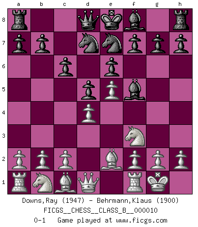Last move : 0-1 2007 January 29 13:48:45 [Event "FICGS__CHESS__CLASS_B__000010"] [Site "FICGS"] [Date "2006.12.16"] [Round "1"] [White "Downs,Ray"] [Black "Behrmann,Klaus"] [Result "0-1"] [WhiteElo "1947"] [BlackElo "1900"] 1.e4 c6 2.d4 d5 3.e5 Bf5 4.Nf3 e6 5.Be2 Nd7 6.O-O Ne7 0-1 This chess game has been lost on time (started : 2006.12.16 22:7:14) Caro-Kann : Advance variation Kingside Castling by player White (move 6) Player Black won this chess game. Follow this game move after move (download)Chess is a more highly symbolic game, but the aggressions are therefore even more frankly represented in the play. It probably began as a war game; that is, the representation of a miniature battle between the forces of two kingdoms. (Karl Meninger) Frage: Was machen Sie mit den Preisen? Anwort: Ich habe Angst, dass meine Freundin davon neue Kleider kauft. (Loek van Wely) Jugadores de primera clase pierden en contra de jugadores de segunda clase porque los jugadores de segunda clase a veces juegan una partida de primer clase. (Siegbert Tarrasch) Vouloir jouer aux échecs contre soi-même est aussi paradoxal que vouloir marcher sur son ombre. (Stefan Zweig) Depression is just anger without enthusiasm. (Unknown)