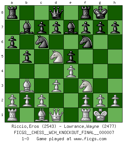 Last move : 1-0 2011 May 28 3:44:50 [Event "FICGS__CHESS__WCH_KNOCKOUT_FINAL__000007"] [Site "FICGS"] [Date "2011.04.01"] [Round "7"] [White "Riccio,Eros"] [Black "Lowrance,Wayne"] [Result "1-0"] [WhiteElo "2543"] [BlackElo "2477"] 1.e4 e5 2.Nf3 Nc6 3.Bb5 a6 4.Ba4 Nf6 5.O-O b5 6.Bb3 Bb7 7.d3 Be7 8.Nc3 O-O 9.Nd5 1-0 Ruy Lopez : Archangelsk (counterthrust) variation Kingside Castling by player White (move 5) Kingside Castling by player Black (move 8) Player White won this chess game. Follow this game move after move (download)All I want to do, ever, is just play Chess. (Bobby Fischer) Ohne ihre Erfolge schmälern zu wollen würde ich sagen Petrosian, Spassky und Karpov verdanken ihre Siege ihren Trainern - Boleslavsky, Bondarevsky und Furman. (Mikhail Moiseyevich Botvinik) Del Ajedrez se ha dicho que la vida no es lo suficientemente larga para él, pero eso es culpa de la vida, no del Ajedrez. (William Ewart Napier) Roi des jeux et jeu des rois, les échecs portent en eux un sentiment d'infini. Ils donnent à celui qui s'est efforcé d'en approfondir les arcanes l'impression de n'être pas à la mesure de l'homme; en fait, ils constituent un résumé de l'univers, un microcosme, et figurent cette grande échelle qui, dans les plans de la lumière descend jusqu'à la matière, qui des abîmes insondables remonte jusqu'en l'infini de Dieu. (Pyrame) There are three kinds of lies: lies, damned lies and statistics. (Mark Twain)