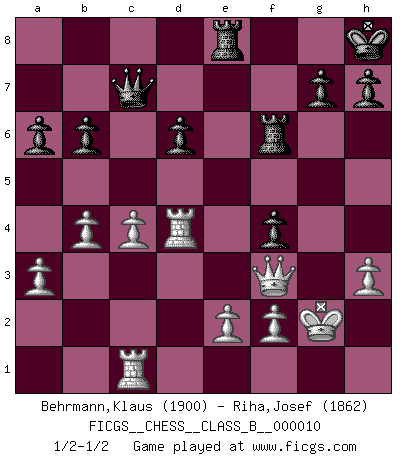 Last move : 1/2-1/2 2007 January 8 15:55:54 [Event "FICGS__CHESS__CLASS_B__000010"] [Site "FICGS"] [Date "2006.12.16"] [Round "1"] [White "Behrmann,Klaus"] [Black "Riha,Josef"] [Result "1/2-1/2"] [WhiteElo "1900"] [BlackElo "1862"] 1.Nf3 Nf6 2.g3 b6 3.Bg2 Bb7 4.O-O e6 5.c4 c5 6.d4 cxd4 7.Qxd4 Be7 8.Nc3 d6 9.Bg5 a6 10.Rfd1 Nbd7 11.b3 O-O 12.Qd2 Nc5 13.Bf4 Nce4 14.Nxe4 Nxe4 15.Qd3 f5 16.Rac1 Rc8 17.h3 Qc7 18.b4 e5 19.Be3 f4 20.gxf4 exf4 21.Bd4 Bd8 22.a3 Bf6 23.Nd2 Nxd2 24.Rxd2 Bxg2 25.Kxg2 Rce8 26.Qf3 Kh8 27.Bxf6 Rxf6 28.Rd4 1/2-1/2 Reti Opening Kingside Castling by player White (move 4) Kingside Castling by player Black (move 11) This chess game ended in a draw. Follow this game move after move (download)All my games are real. (Bobby Fischer) Computer sind die einzigen Gegner, die nicht immer eine Ausrede auf Lager haben, wenn sie gegen mich verlieren. (Robert James Fischer) No todos los artistas son jugadores de Ajedrez, pero todos los jugadores de Ajedrez son artistas. (Marcel Duchamp) J'ai toujours senti une vague pitié pour l'homme qui ne connaît rien aux échecs, tout comme j'en aurais pour un homme ignorant de l'amour. Les Echecs, comme la musique ou comme l'amour, ont le pouvoir de rendre heureux. (Siegbert Tarrasch) As the days dwindle down... to a precious few. (Maxwell Anderson)