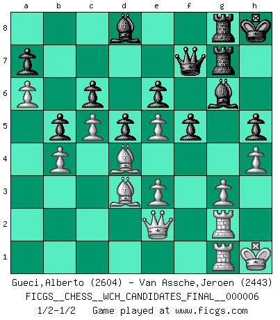 Last move : 1/2-1/2 2011 August 11 18:11:23 [Event "FICGS__CHESS__WCH_CANDIDATES_FINAL__000006"] [Site "FICGS"] [Date "2011.04.01"] [Round "5"] [White "Gueci,Alberto"] [Black "Van Assche,Jeroen"] [Result "1/2-1/2"] [WhiteElo "2604"] [BlackElo "2443"] 1.d4 Nf6 2.Nf3 e6 3.c4 b6 4.g3 Ba6 5.b3 Bb4+ 6.Bd2 Be7 7.Bg2 c6 8.Bc3 d5 9.Ne5 Nfd7 10.Nxd7 Nxd7 11.Nd2 O-O 12.O-O f5 13.a4 Nf6 14.Qc2 Qc7 15.Rfc1 Ne4 16.e3 Rac8 17.f4 Nf6 18.a5 b5 19.c5 Rb8 20.b4 Bc8 21.a6 Bd7 22.Nf3 Be8 23.Ne5 Bh5 24.h3 Nd7 25.Qf2 Nxe5 26.dxe5 g5 27.Bf1 Kh8 28.Bd3 Rg8 29.Kh1 Rg7 30.Rg1 Bg6 31.Bd4 Rbg8 32.Qe2 h5 33.Rg2 Bd8 34.Rag1 Qf7 35.fxg5 Bxg5 36.h4 Bd8 1/2-1/2 Queen's pawn game Kingside Castling by player Black (move 11) Kingside Castling by player White (move 12) This chess game ended in a draw. Follow this game move after move (download)Chess, like any creative activity, can exist only through the combined efforts of those who have creative talent, and those who have the ability to organize their creative work. (Mikhail Botvinnik) Frage des Reporters: -Worin besteht das Ziel von Gambiteröffnungen? Antwort: -Auf Kosten der Partie einen Ruf als Angriffspieler zu erwerben.- (Siegbert Tarrasch) Hay jugadores fuertes y personas amables y yo soy un jugador fuerte. (Bobby Fischer) Toutes les manuvres exécutées sur une colonne ouverte ont pour but ultime l'intrusion définitive sur la septième ou la huitième rangée, en plein cur de la position ennemie. (Aaron Nimzovitch) The human is the only animal species whose members are able to talk themselves into difficulties that would not otherwise exist. (Wendell Johnson)