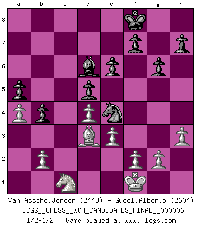 Last move : 1/2-1/2 2011 July 15 22:59:48 [Event "FICGS__CHESS__WCH_CANDIDATES_FINAL__000006"] [Site "FICGS"] [Date "2011.04.01"] [Round "6"] [White "Van Assche,Jeroen"] [Black "Gueci,Alberto"] [Result "1/2-1/2"] [WhiteElo "2443"] [BlackElo "2604"] 1.d4 d5 2.c4 c6 3.Nc3 Nf6 4.Nf3 a6 5.e3 b5 6.c5 Nbd7 7.a3 a5 8.Qe2 Bb7 9.Qc2 g6 10.Nxb5 cxb5 11.c6 Qb6 12.cxb7 Qxb7 13.Bd2 e6 14.Bd3 Ne4 15.O-O Be7 16.Rac1 Nxd2 17.Qxd2 O-O 18.Qe2 b4 19.a4 Rfc8 20.Bb5 Rxc1 21.Rxc1 Rc8 22.Qd1 Bd6 23.Nd2 Rxc1 24.Qxc1 Nf6 25.h3 Kf8 26.Nb3 Qc7 27.Kf1 Qxc1+ 28.Nxc1 Ne4 29.Bd3 1/2-1/2 QGD Slav defense Kingside Castling by player White (move 15) Kingside Castling by player Black (move 17) This chess game ended in a draw. Follow this game move after move (download)Nothing excites jaded Grandmasters more than a theoretical novelty. (Dominic Lawson) Später, ... hatte ich zunehmend Erfolg in entscheidenden Partien. Vielleicht weil ich eine einfache Wahrheit erkannte: nicht nur ich hatte Angst, auch mein Gegner. (Mikhail Nekhemyevich Tal) El Ajedrez es tortura mental. (Garry Kasparov) La vie et les Echecs sont tous les deux une lutte constante. (Lasker) Good luck. You're gonna need it. (Han Solo in Star Wars ep.6)