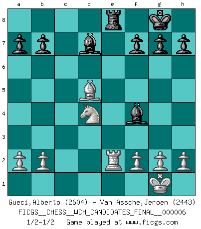 Last move : 1/2-1/2 2011 June 9 12:39:38 [Event "FICGS__CHESS__WCH_CANDIDATES_FINAL__000006"] [Site "FICGS"] [Date "2011.04.01"] [Round "7"] [White "Gueci,Alberto"] [Black "Van Assche,Jeroen"] [Result "1/2-1/2"] [WhiteElo "2604"] [BlackElo "2443"] 1.d4 Nf6 2.Bg5 d5 3.Bxf6 exf6 4.e3 Bd6 5.c4 dxc4 6.Bxc4 O-O 7.Nc3 f5 8.Nf3 Nd7 9.O-O Nf6 10.Nb5 Be7 11.Nc3 Bd6 12.Nb5 Be7 13.Nc3 c6 14.Qc2 Bd6 15.Rfe1 Qe7 16.e4 fxe4 17.Nxe4 Nxe4 18.Rxe4 Qf6 19.Re3 Bf5 20.Qc3 Bf4 21.Re2 Rae8 22.Ne5 c5 23.Rae1 cxd4 24.Qxd4 Be6 25.Nf3 Qxd4 26.Nxd4 Bd7 27.Bd5 Rxe2 28.Rxe2 Re8 1/2-1/2 Trompowsky attack (Ruth, Opovcensky Opening) Kingside Castling by player Black (move 6) Kingside Castling by player White (move 9) This chess game ended in a draw. Follow this game move after move (download)The blunders are all there on the board, waiting to be made. (Savielly Tartakover) Ein Teil des Fehlers ist immer korrekt. (Savielly Grigorievitsch Tartakower) El Ajedrez es un expediente tonto que hace creer a la gente inactiva que hacen una cosa muy astuta cuando solamente estan perdiendo su tiempo. (George Bernard Shaw) Le profane ne songe pas à la somme de jouissance dont il se prive, qui méconnaît ce jeu aux ressources aussi variées que passionnantes. (Jean-Marie Jeanton-Lamarche) It is not titles that honor men, but men that honor titles. (Niccolo Machiavelli)