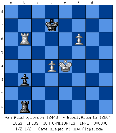 Last move : 1/2-1/2 2011 October 4 21:45:22 [Event "FICGS__CHESS__WCH_CANDIDATES_FINAL__000006"] [Site "FICGS"] [Date "2011.04.01"] [Round "8"] [White "Van Assche,Jeroen"] [Black "Gueci,Alberto"] [Result "1/2-1/2"] [WhiteElo "2443"] [BlackElo "2604"] 1.d4 d5 2.c4 c6 3.Nc3 Nf6 4.Nf3 e6 5.Bg5 h6 6.Bh4 dxc4 7.e4 g5 8.Bg3 b5 9.Be2 Bb7 10.O-O Nbd7 11.Ne5 h5 12.Nxd7 Qxd7 13.Qc1 Rg8 14.Rd1 Bb4 15.Qe3 Ng4 16.Bxg4 hxg4 17.Rac1 a6 18.b3 cxb3 19.axb3 Qe7 20.Qe2 f5 21.exf5 exf5 22.Qc2 Qd7 23.Re1+ Kf7 24.Re5 Kf6 25.f4 gxf3 26.Rf1 Kg6 27.Rxf3 Rgf8 28.h4 Rae8 29.Qd2 Qd8 30.Qf2 Bc8 31.hxg5 f4 32.Bxf4 Bg4 33.Qh4 Rh8 34.Rxe8 Rxh4 35.Rxd8 Bxf3 36.Bg3 Rg4 37.gxf3 Rxg3+ 38.Kf2 Rxg5 39.Rc8 Kf5 40.Rxc6 Rg6 41.Rc8 Bxc3 42.Rxc3 Rh6 43.Ke3 Rh1 44.Rc5+ Ke6 45.f4 Rh3+ 46.Ke4 Rxb3 47.Rc6+ Kd7 48.Rxa6 b4 49.f5 Rb1 50.f6 b3 51.Rb6 1/2-1/2 QGD Slav defense Kingside Castling by player White (move 10) 10 pieces endgame at move 41 : White KRPPP , Black KRBPP WHITE : King + 1 Rook 3 Pawns BLACK : King + 1 Rook 1 Bishop 2 Pawns 9 pieces endgame at move 42 : White KRPPP , Black KRPP WHITE : King + 1 Rook 3 Pawns BLACK : King + 1 Rook 2 Pawns 8 pieces endgame at move 46 : White KRPP , Black KRPP WHITE : King + 1 Rook 2 Pawns BLACK : King + 1 Rook 2 Pawns 7 pieces endgame at move 48 : White KRPP , Black KRP WHITE : King + 1 Rook 2 Pawns BLACK : King + 1 Rook 1 Pawn This chess game ended in a draw. Follow this game move after move (download)Chess is above all, a fight ! (Emanuel Lasker) Ich verlor meine Bürgerrechte, mein Gehalt wurde mir nicht mehr bezahlt und ich wurde zensiert und durfte nicht mehr ins Ausland reisen. [nach dem Match Fischer-Taimanov 6:0] (Mark Taimanov) A la fecha, Fischer esta simplemente un nivel arriba de todos los mejores jugadores de Ajedrez del mundo. (John Jacobs) Les Echecs ont trois composantes : le temps, l'espace et le matériel en dernier. (Mikhail Tal) Remember : Your focus determines your reality. (Qui-Gon Jinn in Star Wars ep.1)